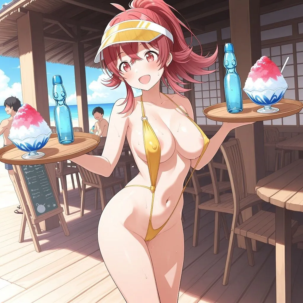 後半はバイトに慣れて露出激しい水着で接客し、ノリノリで性奉仕するわ