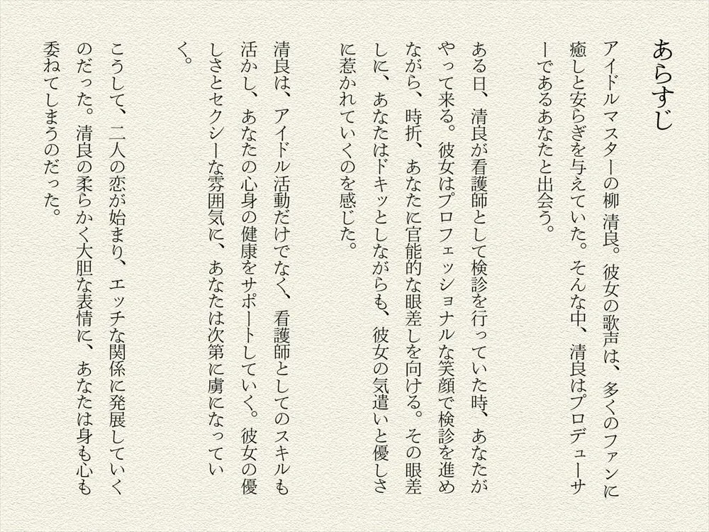 この作品は柳清良〜彼女の歌声は、心に響く癒しの処方箋〜で、柳清良は落ち着いた雰囲気と癒しのプロフェッショナルである元看護師のアイドルなんだよ