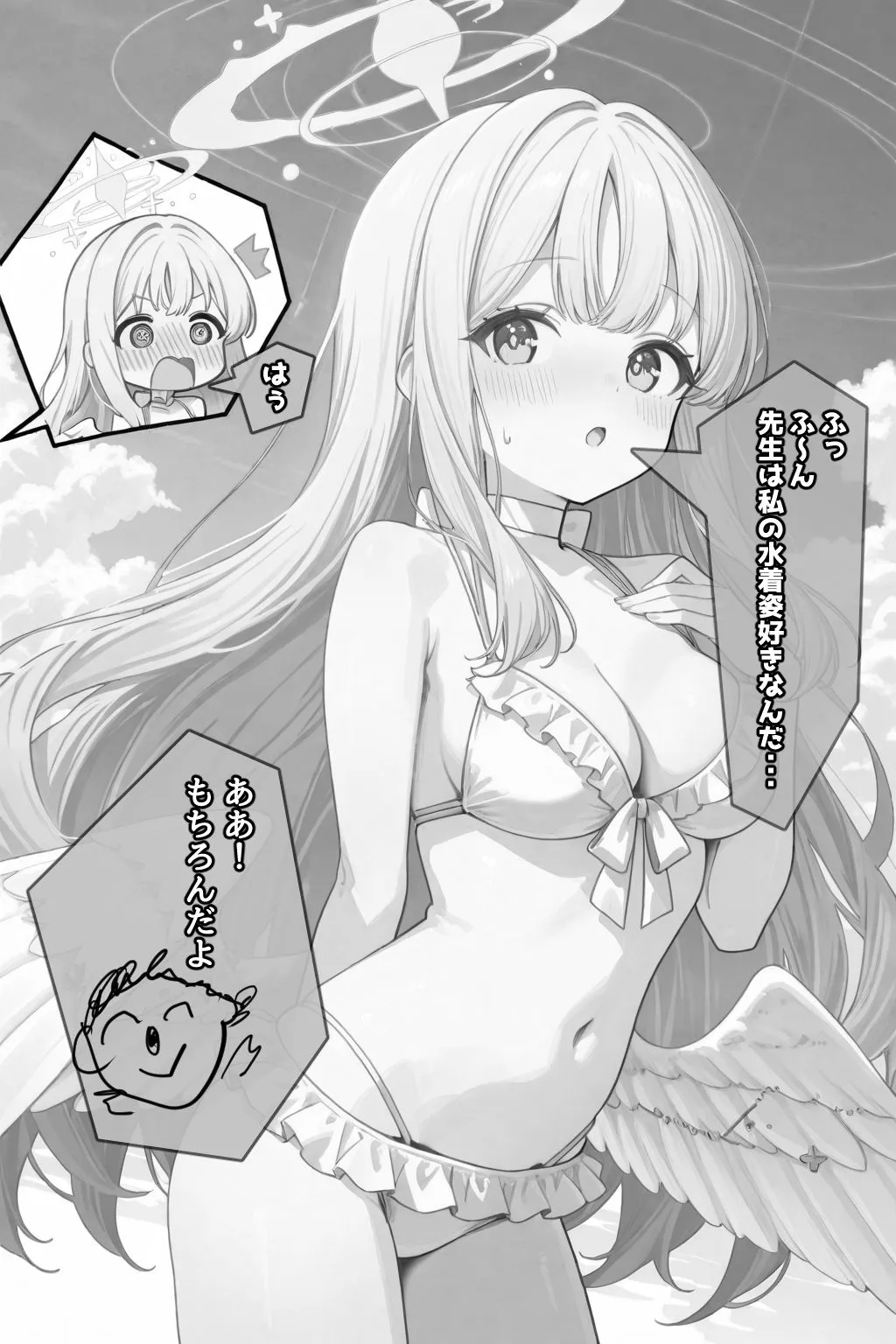 頰を赤らめ、潤んだ瞳で見つめながら、水着の肩紐をそっと指先でずらしていくよ