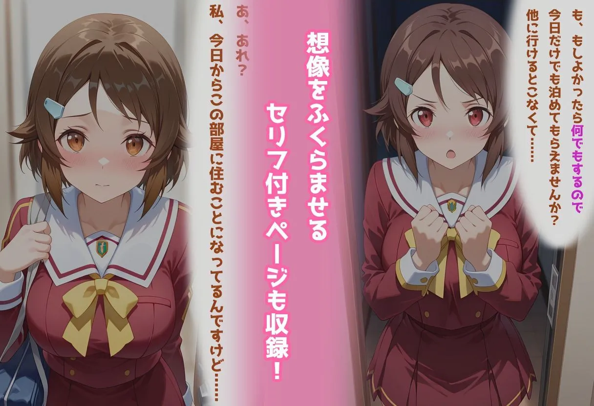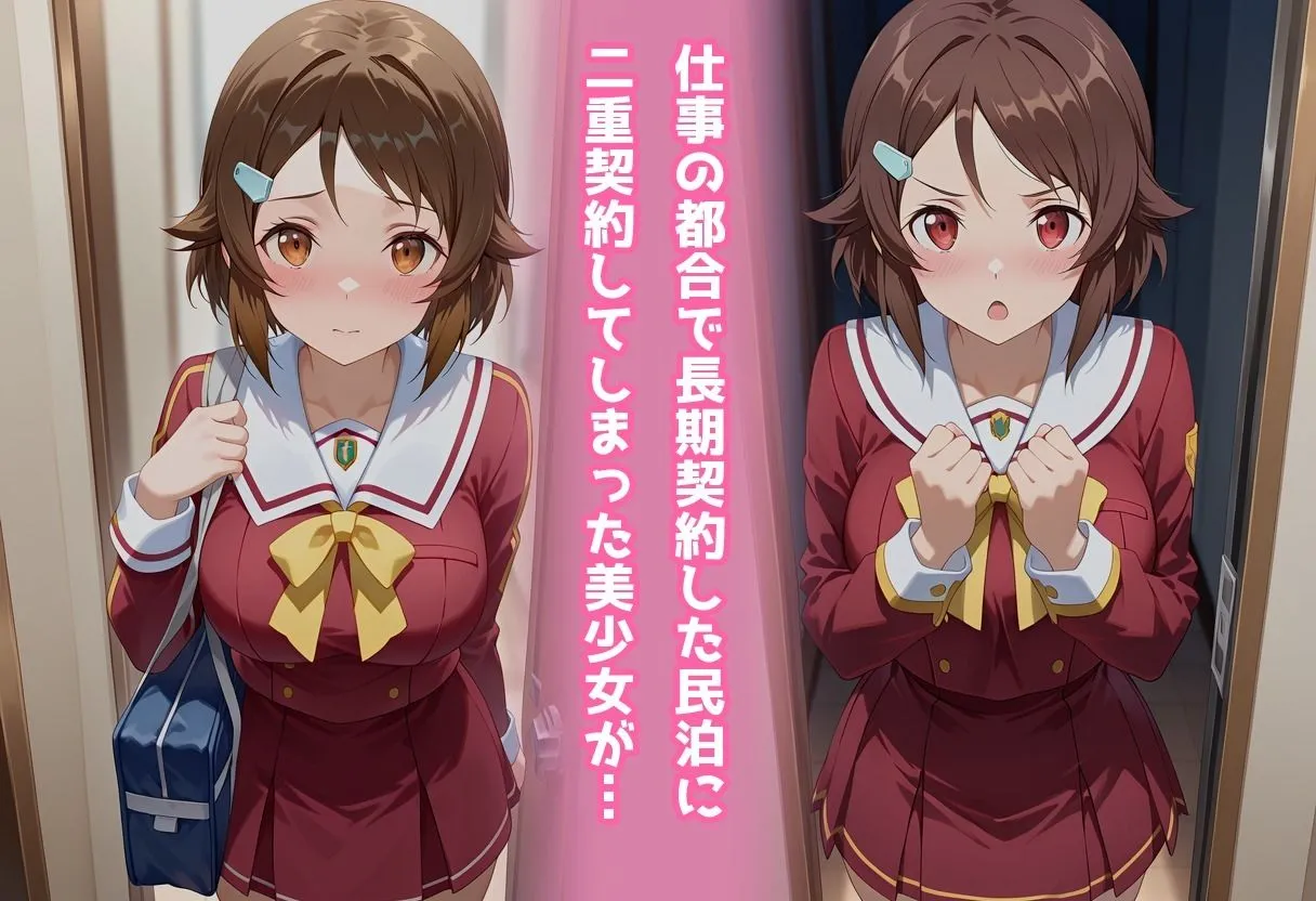 【あらすじ】長期滞在のために契約した民泊。家具も揃い、静かに過ごせるはずの空間に――ある日、見知らぬ美少女がバッグを持って現れた。彼女の口から告げられたのは「自分もここに長期契約した」という信じがたい事実。管理者は海外在住、サポートは返事も遅く、解決の目処は立たない。途方に暮れていると、彼女は涙目で懇願する。「他に行くところもないんです……何でもするので、ここに住ませてもらえませんか?」こうして奇妙な‘二重契約’トラブルは放置されたまま、避けられない二人きりの同居生活が幕を開ける――。【プレイ内容・シチュエーション】部屋に来たところからリビングに通して、キッチン、シャワー、ベッドとそれぞれのシチュエーションで着衣からヌードでの行為までストーリー性のある画像の詰め合わせになっています。・パンチラ・胸チラ・乳揉み・フェラ・イラマチオ・口内射精・立ちバック・片足上げ挿入・座位・正常位・騎乗位・中出しetc…【基本情報】作品形式:フルカラーJPG画像ファイル500枚(セリフ及びモノローグページ10枚込)画像サイズ:1664px×2432px【注意事項】※本作はStableDiffusionを使用したAI生成画像を厳選し、加筆・修正した作品となります。※AIで生成された画像は、実在の人物・キャラクターに類似している場合がありますが、それは偶然の一致であり、一切関係がありません。※技術的な制約やAIの学習データによって、細部に破綻や不自然さが含まれる場合があります。購入前に、そのことを理解し、同意した上で購入を検討していただくことをお願いいたします。※被写体は全て成人しており、コスチュームでのプレイとなります。※AI作品にご理解のある方のご購入をお願いします。