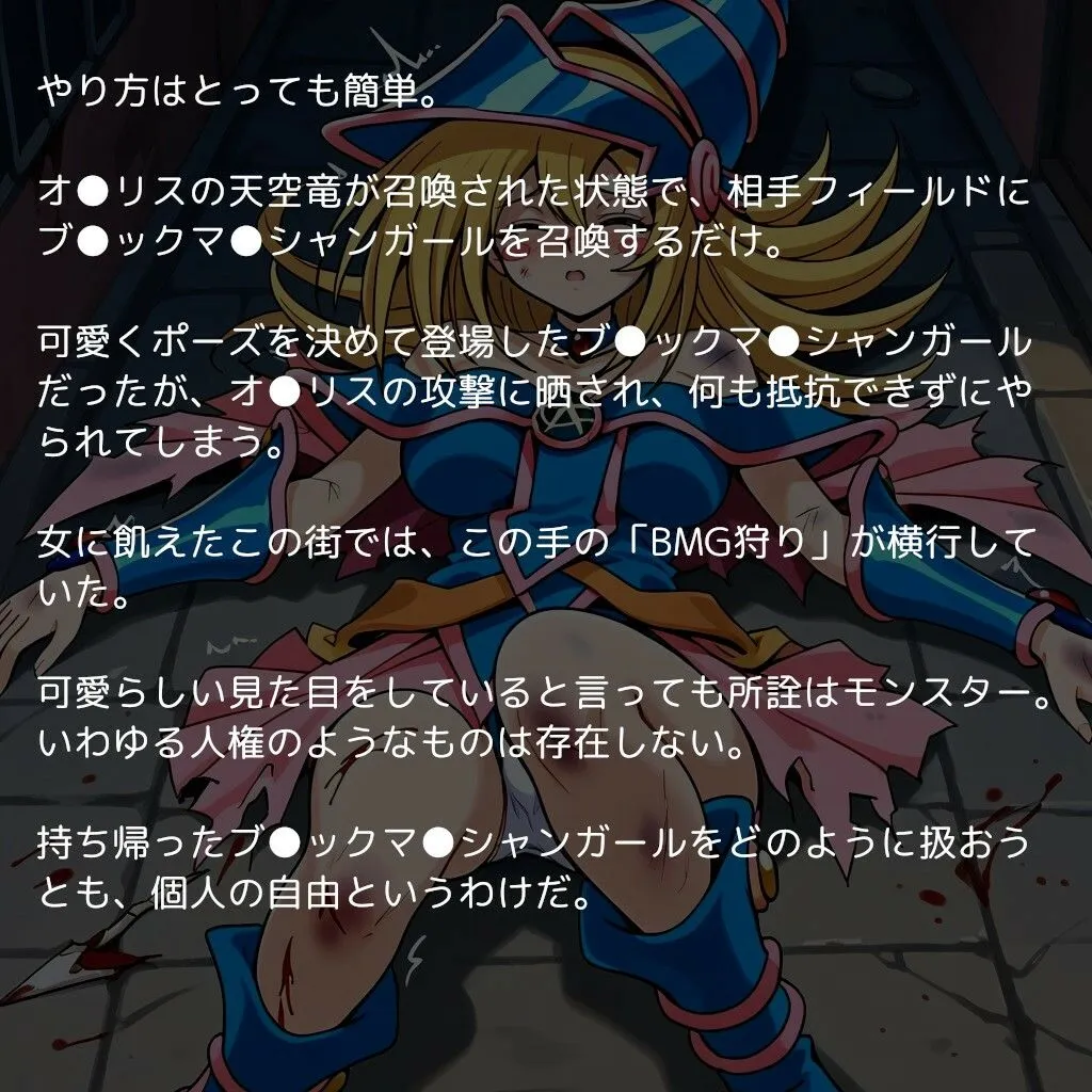 あかねやり方はとっても簡単だよ。オ●リスの天空竜が召喚された状態で、相手フィールドにブ●ックマ●シャンガールを召喚するだけなんだ