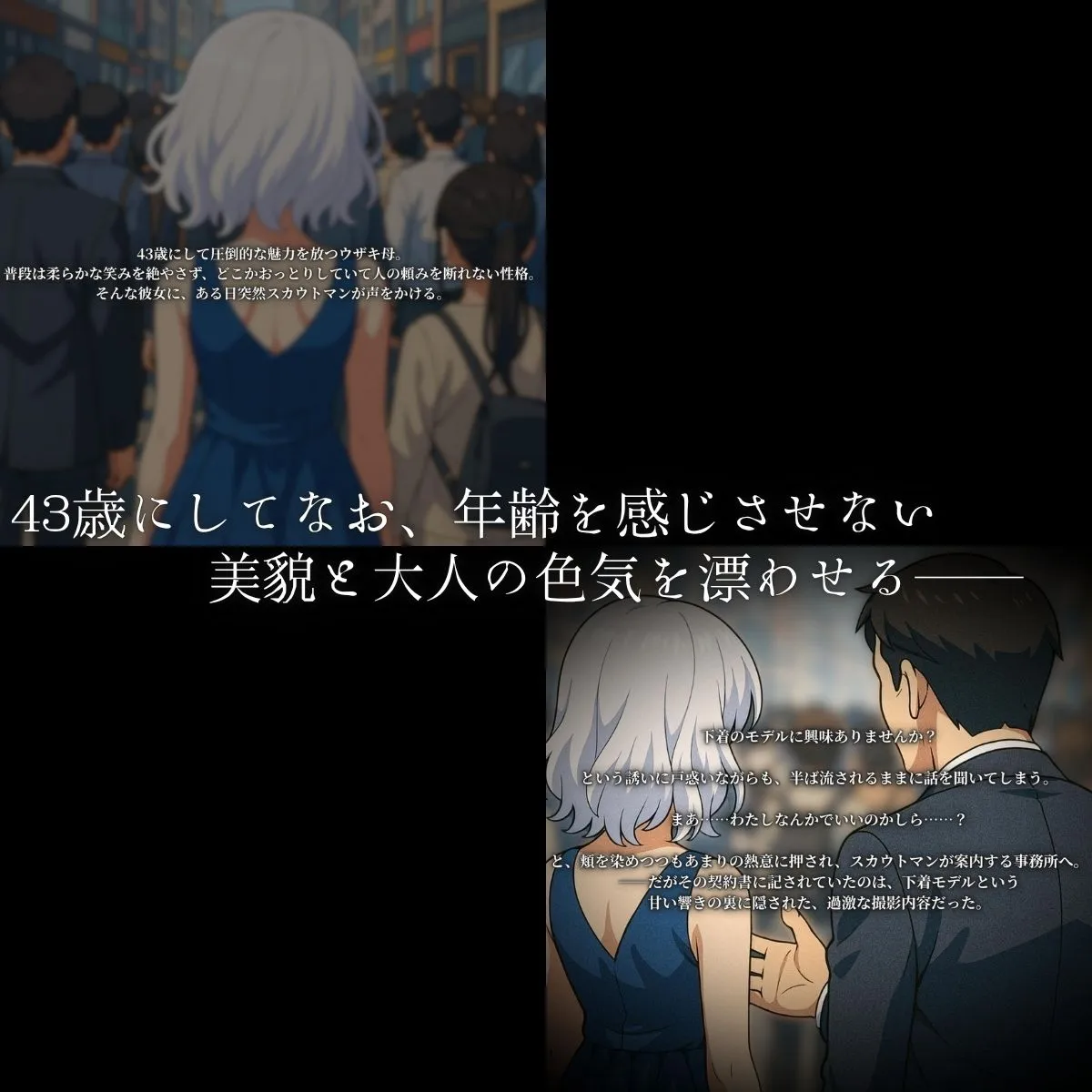 齢43にして全く年齢を感じさせない美貌と色気を漂わせる一人の母親。加えてボディも豊満。そのおかげもあってか道端で下着モデルのスカウトを受ける。押しに弱い母親は言われるがまま事務所で詳しい話を聞くことに…差し出された契約書にはデタラメ無ことが記載されていたが、スカウトマンに言いくるめられそのままサインしてしまう。これがAV出演への始まりだった――。撮影現場は男だらけ、最初は下着でのポージングだったが徐々に過激さを増していき。気がつけばそれはモデルの仕事ではなく、女優としての演技を求められるようになっていった…撮影は本格的なAV撮影へと姿を変えていき、知らぬ間にAVデビューを果たす母親であった。本編文字あり:64P(1ページ1コマ)画像集:436枚※本作はAIを使用し作成しております。