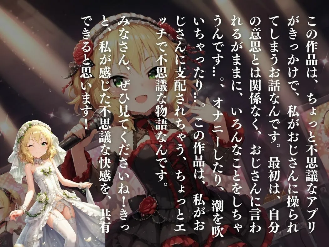 あかねこの作品は『お嬢様の秘めた欲望操られる身体、芽生える本心』っていうCG集で、上品でお嬢様なアイドル、櫻●桃華が謎のアプリでおじさんに支配されてしまう禁断のストーリーなんだよ