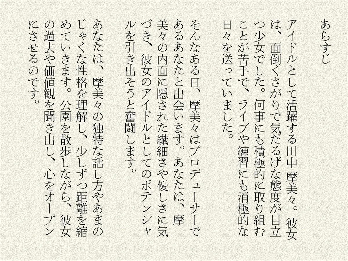 あらすじはアイドルとして活躍する田中摩美々で、面倒くさがりで気だるげな態度が目立つ少女なんだけど