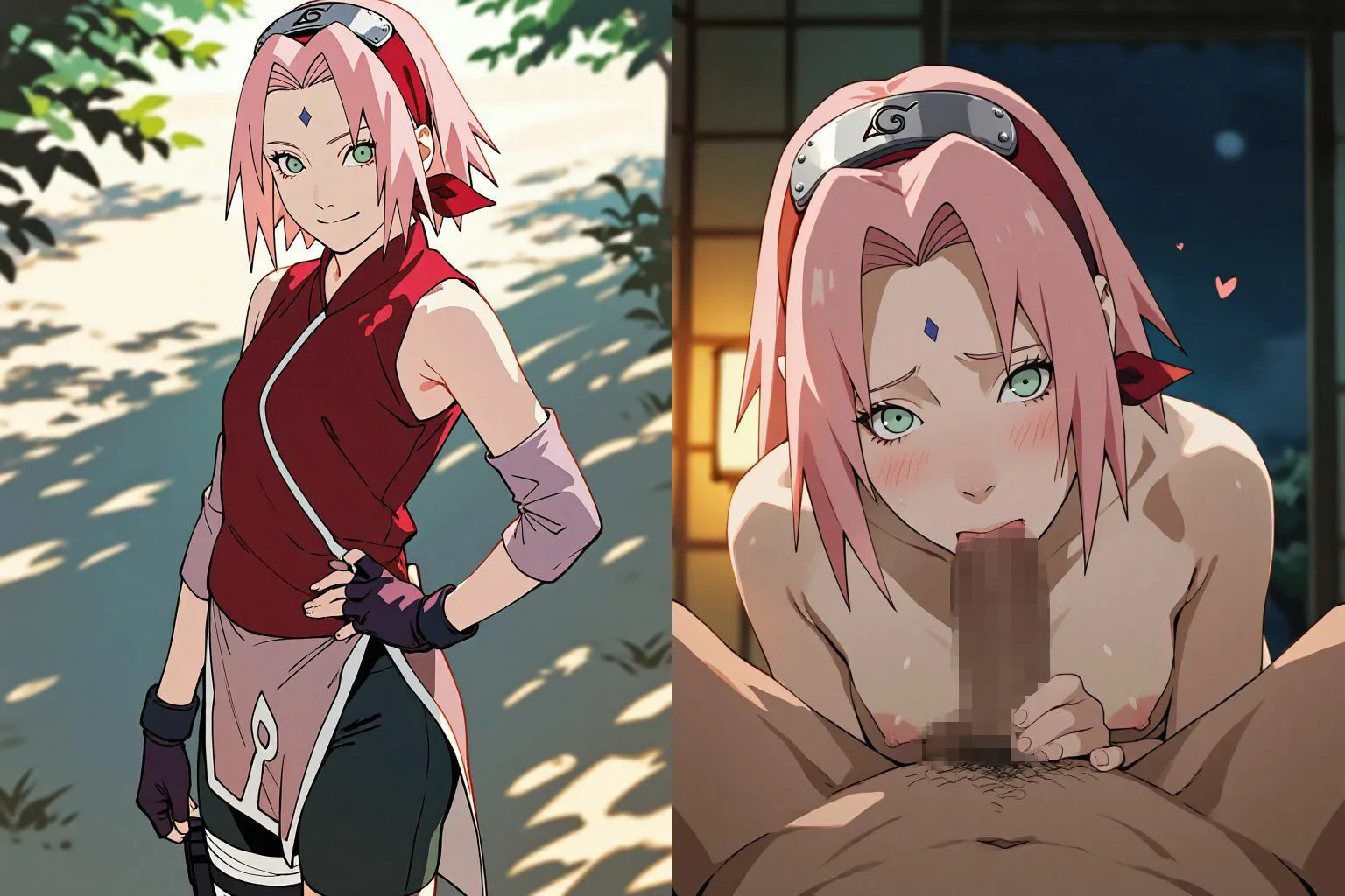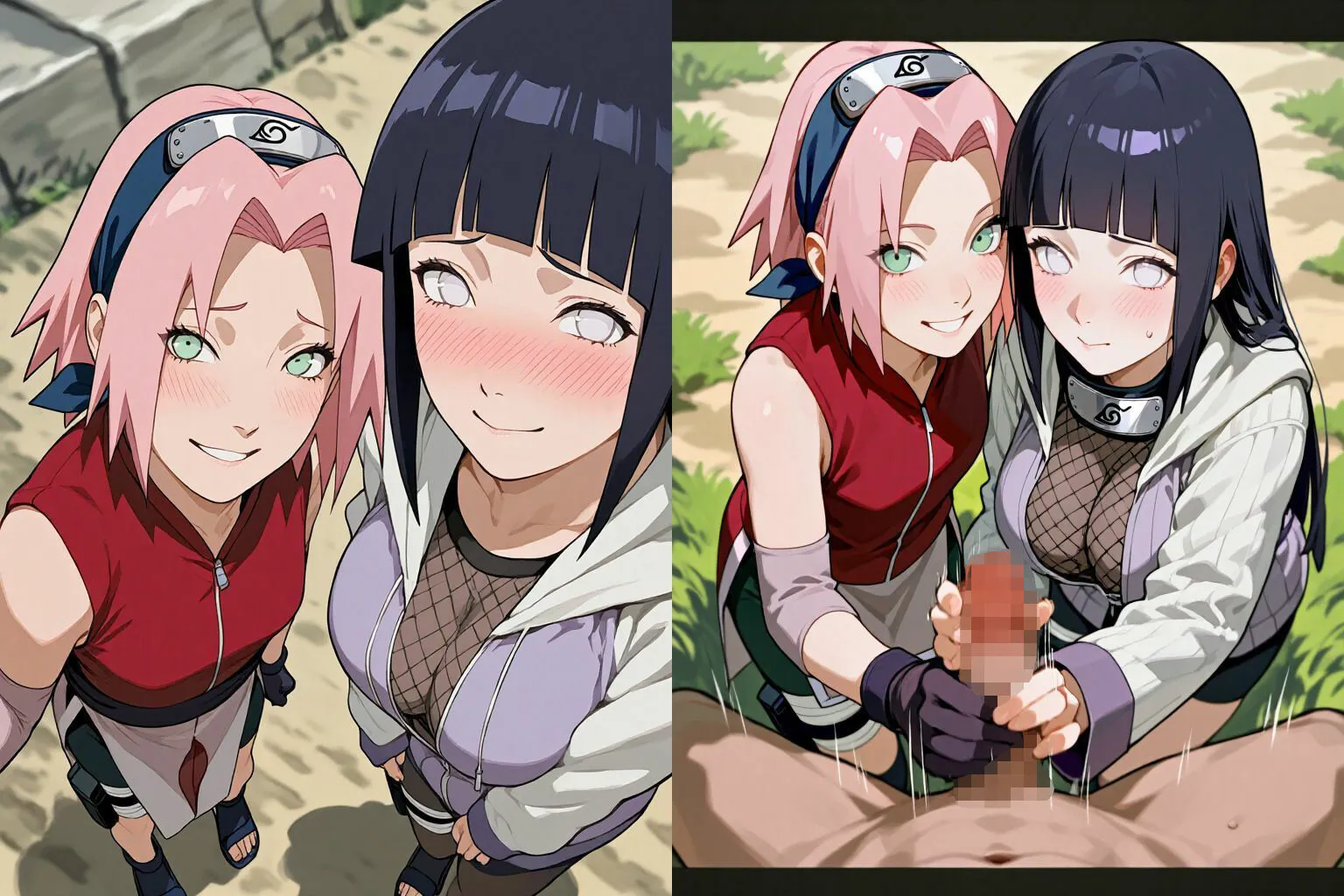 ヒナタの爆乳と人妻の包容力、サクラの滑らかなパイパンと積極的な奉仕、乱れれるくのいちが堪能できるよね