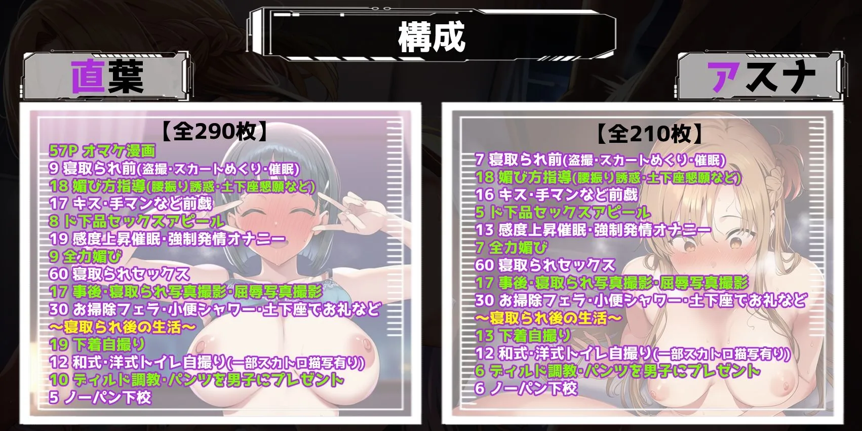 含まれるジャンルは寝取られ羞恥、恥辱尊厳破壊、催眠、洗脳、常識改変だね