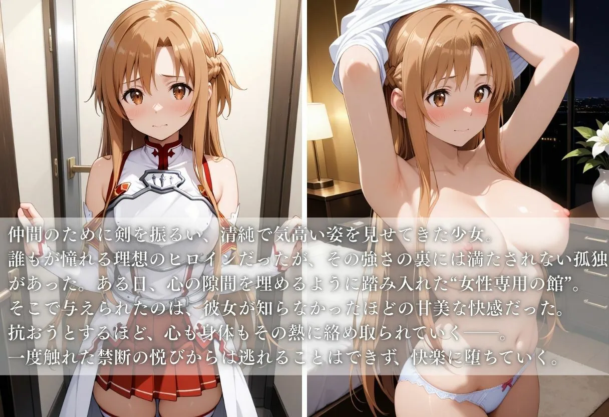 ※サンプル画像は本編より荒く、モザイクも大きくなっております。※アナルは全て無修正となります。【ストーリー】仲間のために剣を振るい、清純で気高い姿を見せてきた少女。誰もが憧れる理想のヒロインだったが、その強さの裏には満たされない孤独があった。ある日、心の隙間を埋めるように踏み入れた‘女性専用の館’。そこで与えられたのは、彼女が知らなかったほどの甘美な快感だった。抗おうとするほど、心も身体もその熱に絡め取られていく──。一度触れた禁断の悦びからは、もう逃れることはできない。清純なヒロインは、快楽に堕ちていく。【登場人物】ソードアート・オンラインアスナ【シーン】[ホテル]1着衣2ブラ外し3パンツ脱ぎ(上裸)4恥ずかしがって隠す(全裸・胸隠し)5シャワーシーン6手マンクンニ7潮吹き8事後9セクシー下着10ベットで横になる11乳首をつまむ12乳首舐め、脇舐め13手マンクンニ14潮吹き15絶頂16ちんこ凝視17手コキ18イマラチオ19性行為20絶頂21事後[自分の部屋]1恥ずかしがって佇む2まんこクパァ3オナニー4大人のおもちゃ5事後※この作品はAIを利用して作成したものです。※StableDiffusionを使用して生成しております※技術的な制約やAIの学習データによって、細部に破綻や不自然さが含まれる場合があります。購入前に、そのことを理解し、同意した上で購入を検討していただくことをお願いいたします。※購入後の取り扱いに不備があった場合こちらは一切責任を負いません。※商用目的での利用・第三者への譲渡・転載等が発見された際には法的処置をとらせていただき、損害賠償請求を致します。