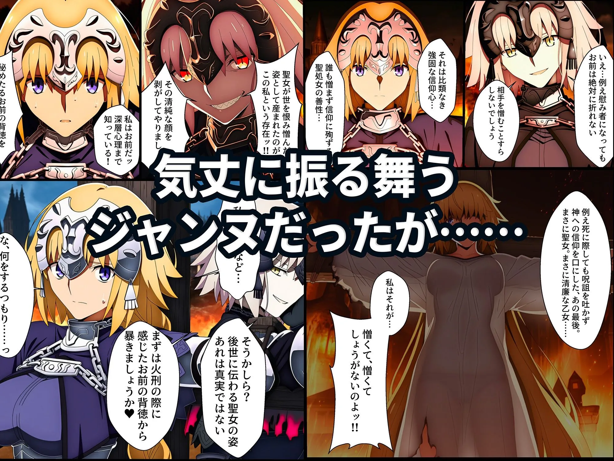 ■あらすじ「聖女の信仰は、快楽に折れる──」己を犠牲にしてマスターを救ったジャンヌ・ダルク。しかし、待ち受けていたのは竜の魔女ジャンヌ・オルタによる捕縛と調教だった。羞恥に晒され、衆目の中で開発されていく純潔の聖女。生前の記憶を抉られ、秘めた背徳を暴かれながら──その信仰と誇りは、快楽の中で崩れ落ちていく。しかし聖女を開発していく中、魔女にも予想できない展開が待ち受けていた。■内容・観衆の前で公開絶頂責め・敵兵に辱められた最後の夜を再現する媚薬責め・媚薬で敏感になった体を襲う全身くすぐりアクメ・魔女の配下による連続絶頂地獄■収録内容・本編71ページ・PDFファイル※AI生成画像を加筆修正し漫画形式にしております。