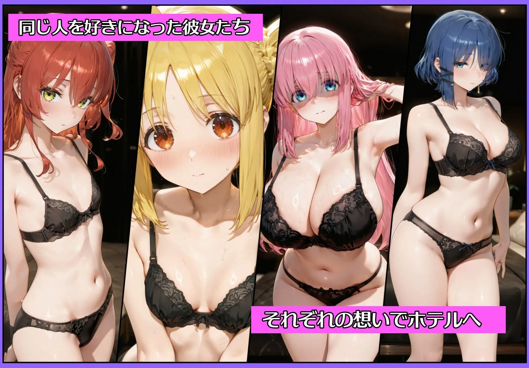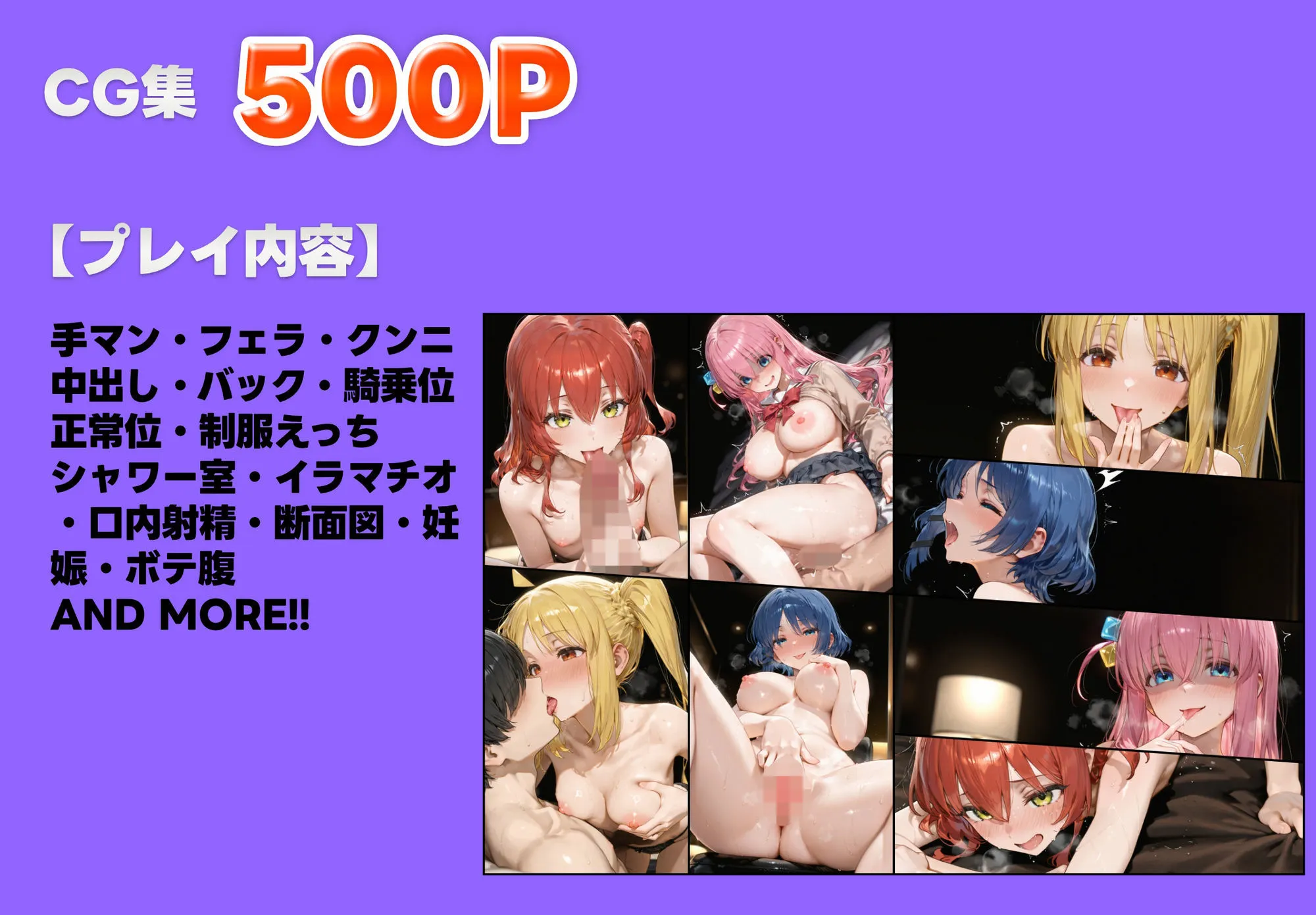 作品あらすじ原作から5年。結束バンドはメジャーデビューを果たし、人気絶頂。20代半ばになった4人は、見た目も心も完全に大人。でも、たったひとつだけ、誰にも言えなかった想いがあった。「マネージャー(あなた)……大好きすぎて、もう我慢できない(はーと)」ある日のリハ後、楽屋で爆弾発覚。虹夏「ねぇ、実は相談が……」ぼっち「私も……」リョウ「奇遇だな」郁代「ちょっと!私も今言おうとしてたのに!!」せーの!「マネージャーのこと、死ぬほど好きです!!」全員フリーズ。虹夏「これは……争奪戦だよね?」ぼっち(小声)「私なんて勝ち目ないから……みんなで共有しちゃっても……嬉しい……(はーと)」三人「「「お前が一番ヤバいわ!!!」」最終的に決まったルールはこう。・公平にデート権、各1回・セックスOK、でもゴムはちゃんと着ける・だれが選ばれても恨みっこなし……表向きは。本音は全員同じだった。郁代「デート1回?そんなんで決まるわけない(はーと)ここは種付け確定させるしかない……」虹夏「ルールはルールだけど……ゴム?破っちゃうかも(はーと)」リョウ「公平なルール……最高の勝機だ。今日で確実に孕む」ぼっち(頬を赤らめて)「マネージャーさんの赤ちゃん……絶対欲しい……(はーと)」かくして「ちんぽ共有しちゃいます!」宣言のもと、たった1回のデートで全員妊娠を狙うちんぽ争奪戦が始まった。デート後、ホテルに連れ込まれるたびに響く声。「今日は安全日だから……中に出してもいいよ(はーと)」「ゴム、邪魔だから外して……?」「私の子宮、今日だけ空いてる……全部注いで(はーと)」「私…赤ちゃんほしいなぁ(はーと)」懐かしの制服も持ってきちゃった!争奪戦?が今始まる!【プレイ内容】デートからのラブホ直行、下着姿、クンニ、フェラ、バック、中出し、騎乗位、正常位、シャワー室、イラマチオ、口内射精、制服プレイ、断面図、妊娠、ボテ腹【収録内容】コンセプトCG集500枚より世界観に没入していただける仕上がりになってます。1560*2280png形式AIを利用して出力した画像になります。登場する女性はすべて18歳以上の成人です。