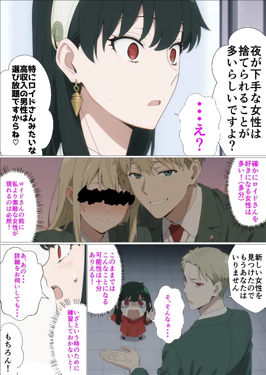 このままじゃロイドさんに見捨てれる!家族崩壊を危惧したヨルはセックスの腕を磨くため、女性用風俗に通う事にした。しかし、思いのほか気持ちよくなってしまったヨルは、徐々にチンコにおぼれていく・・・プレイ内容・フェラ・バック・蟹股騎乗位・オナニー・ヨル私服・ヨル戦闘服ページ数32P