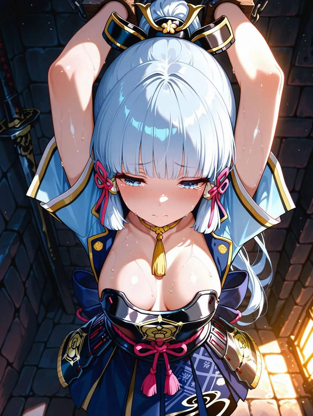 構成は拘束50枚から始まるのよ。ダンジョンに潜入の真剣な表情、拘束で局部強調、下着、口かせ、目隠し、裸なんだけど