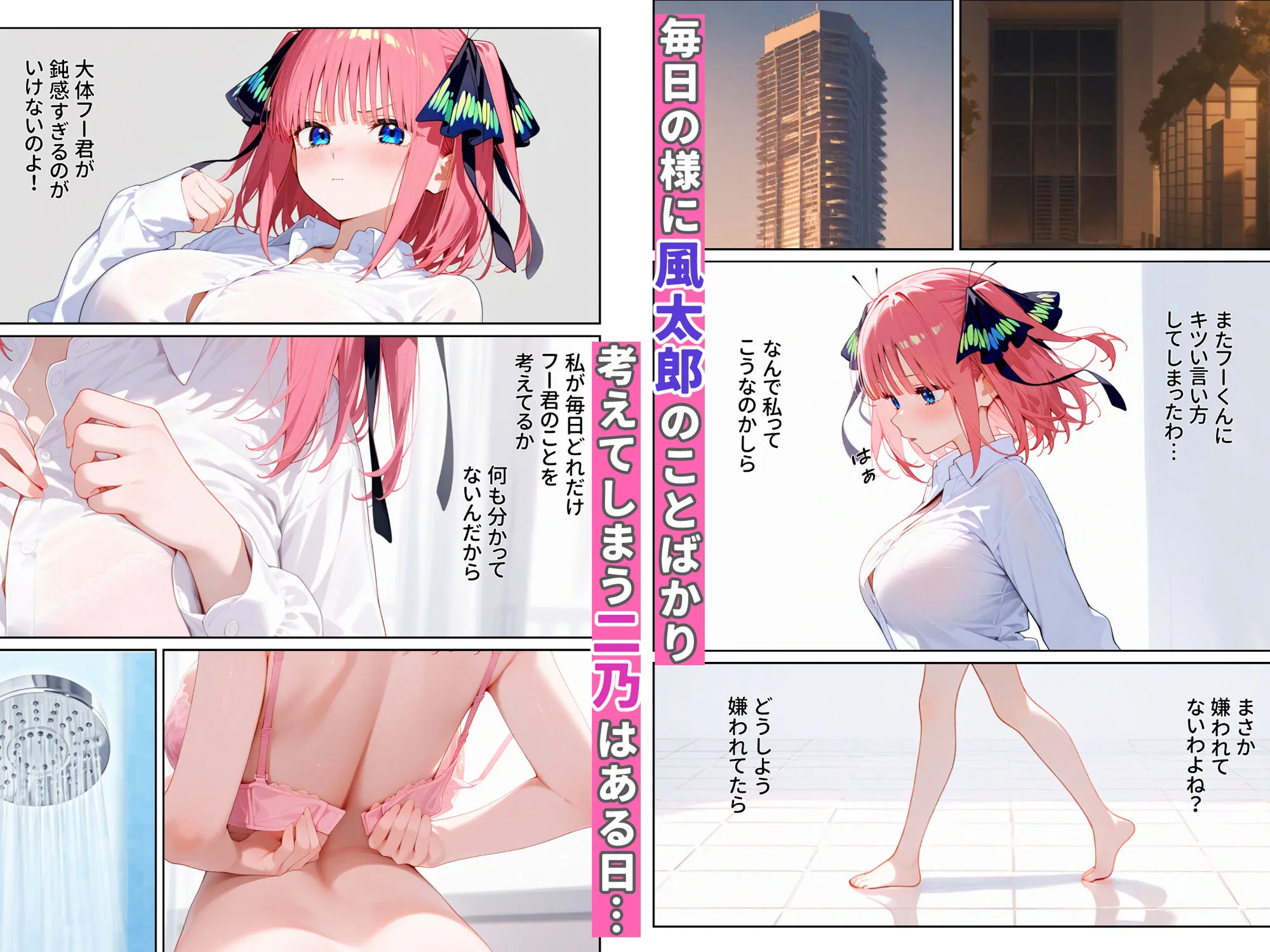 その夢が忘れられず、夢の中の風太郎を思い出しながら妄想オナニーに夢中になる二乃のとある一日を描いてるんだ