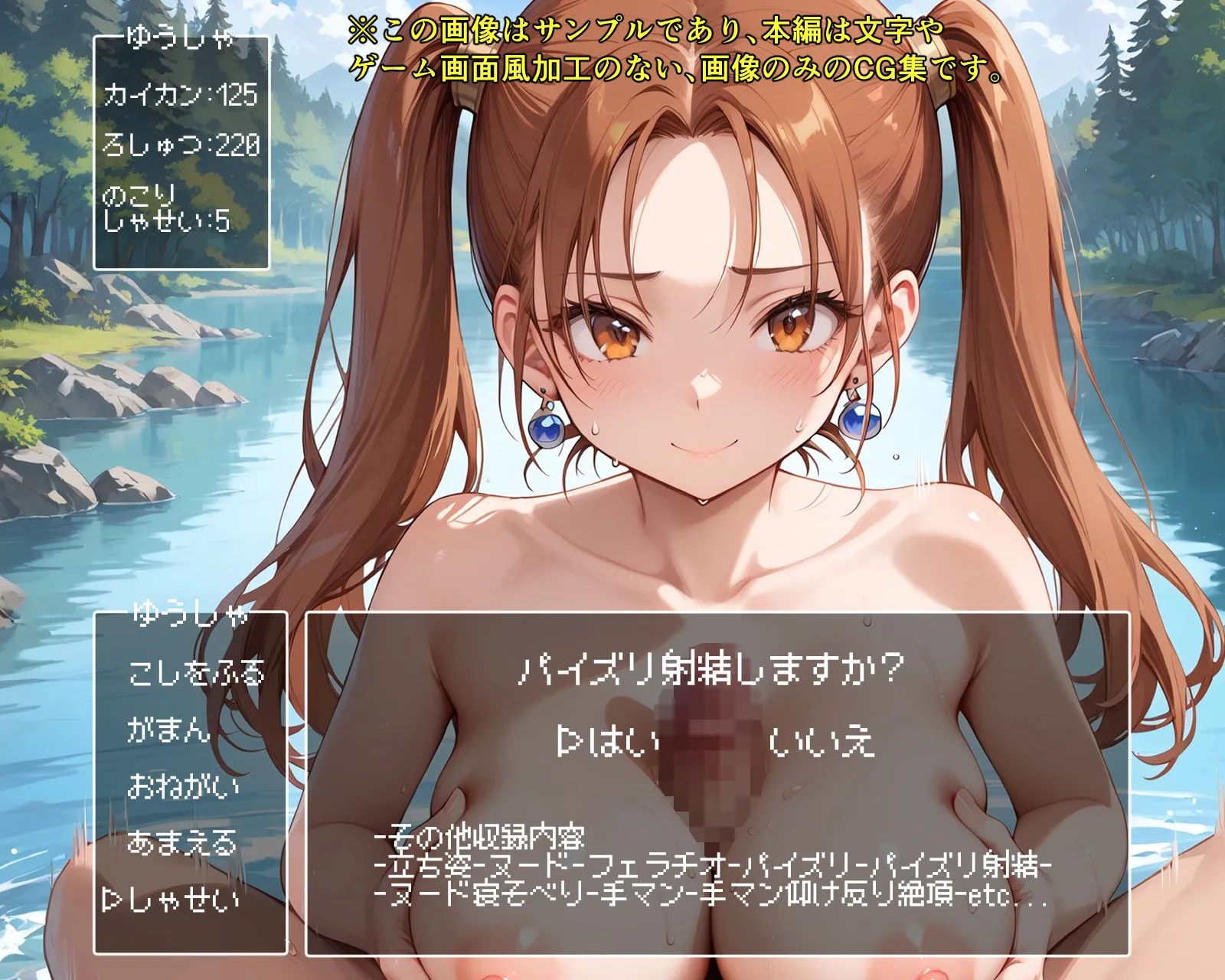 シチュエーション例の1番目は旅の途中に水場で…で、立ち姿、ヌード、フェラチオ、パイズリ、パイズリ射精、ヌード寝そべり、手マン、手マン仰け反り絶頂、etc…よ
