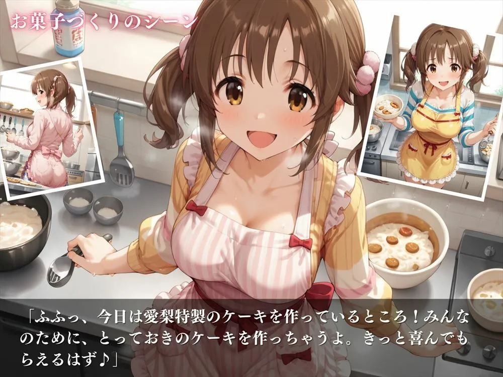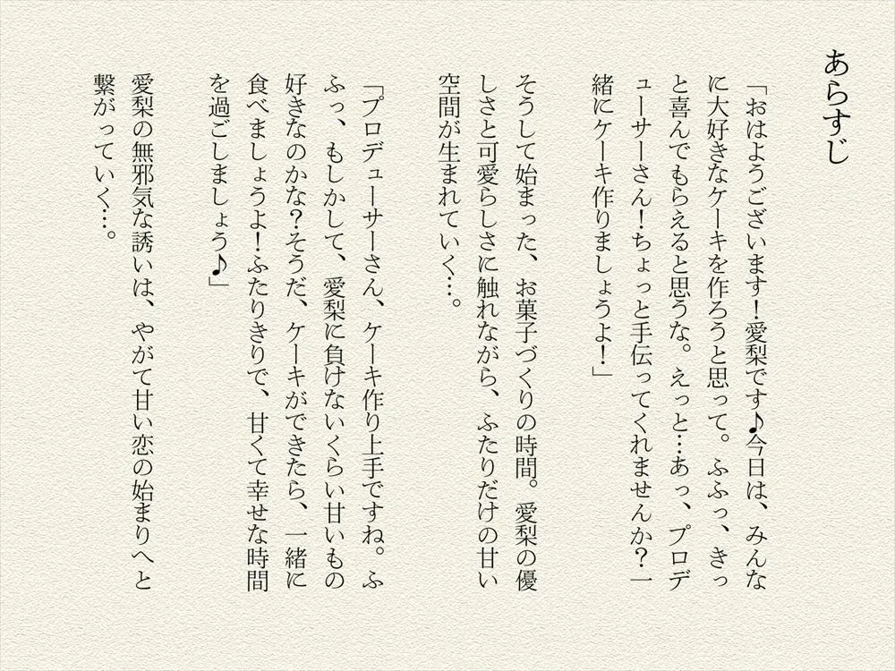 あらすじは愛梨がお菓子作りでプロデューサーと甘い時間を過ごすのよ。ふたりきりで幸せな時間だわ