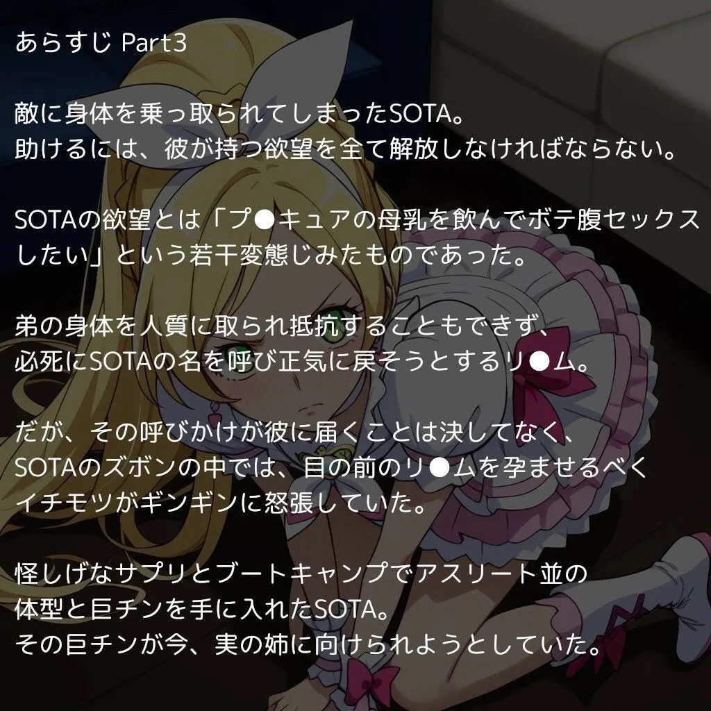 助けるには彼の欲望を全て解放しなきゃいけないんだけど、その欲望が『プ●キュアの母乳を飲んでボテ腹セックスしたい』っていう変態じみたものなのよ