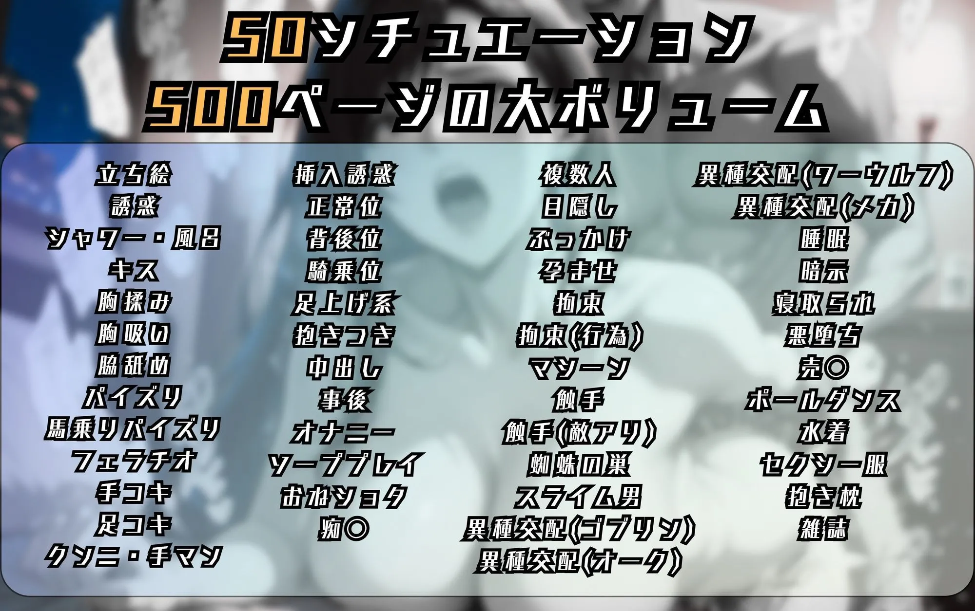 寝取られ、悪落ち、売春、ポールダンス、水着、セクシー服、抱き枕、雑誌まで50種類全部カバーしてるよね