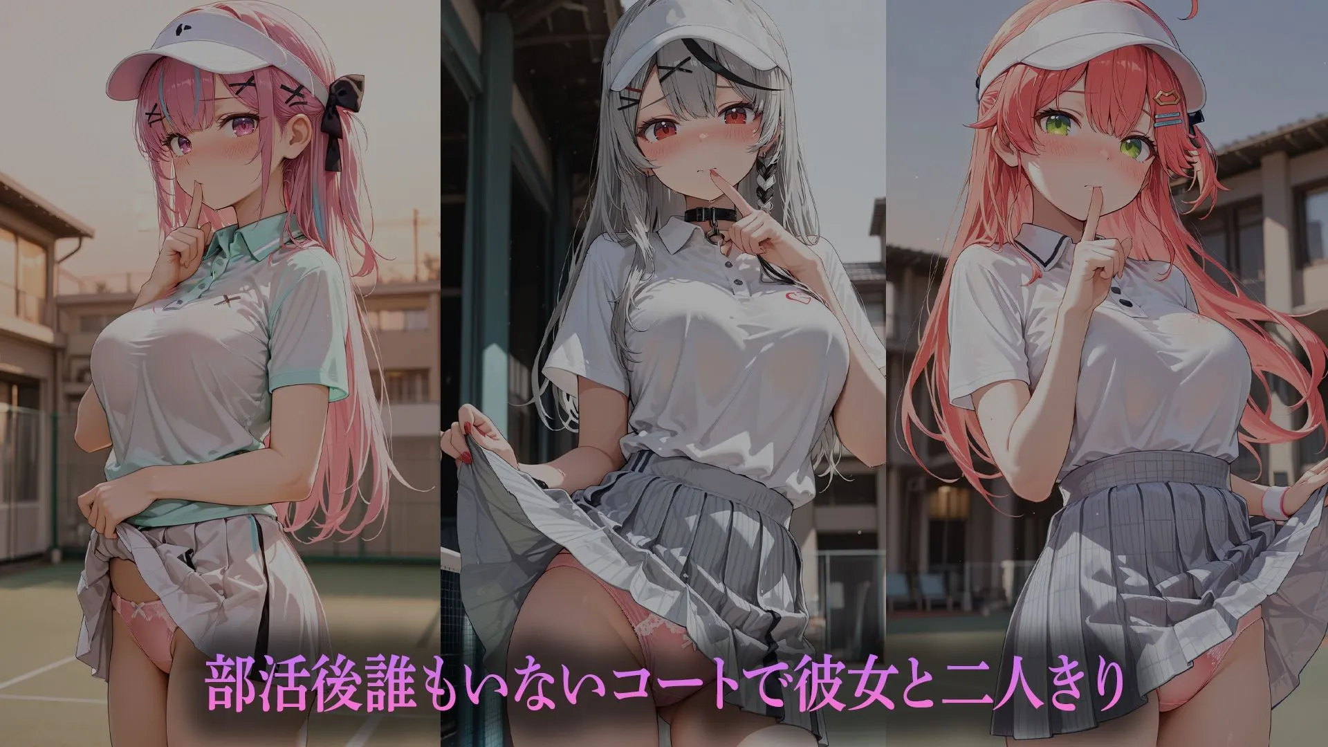 放課後、部活を終えたテニスコート。他の部員たちは帰り、残されたのは彼女と二人きり。汗ばんだユニフォーム姿の彼女、夕日に照らされるコート。練習の疲れも忘れて、二人の間に流れる甘い空気――「ねえ…もう誰もいないよ…」抑えきれない想いが高まり、誰もいないコートで距離が縮まる。恥ずかしそうに頬を染めながらも、彼女は身を委ねてくれる。ネットの影、ベンチの横、フェンスの近く――開放的なコートで、若い身体が激しく絡み合う。汗の匂い、荒い息遣い、制止できない欲望。誰かが来るかもしれないスリルの中、青春の衝動のまま、二人は夢中で求め合う。夕暮れのコートで繰り広げられる、若さと情熱に溢れた秘密の時間。—————————————————————-収録キャラ宝鐘マ〇ンさくら〇こ湊あ〇あ百鬼あ〇め桃鈴〇ね雪花ラ〇ィ沙花叉ク〇ヱフ〇ワ・ア〇スガードモ〇コ・ア〇スガード常闇〇ワ一条〇々華虎金妃〇虎輪堂〇速綺々羅々〇ィ〇ィ—————————————————————-■注意事項◆本作登場人物は20歳以上です。◆こちらの作品はAI生成画像です。手足指などが乱れてる場合がございます。