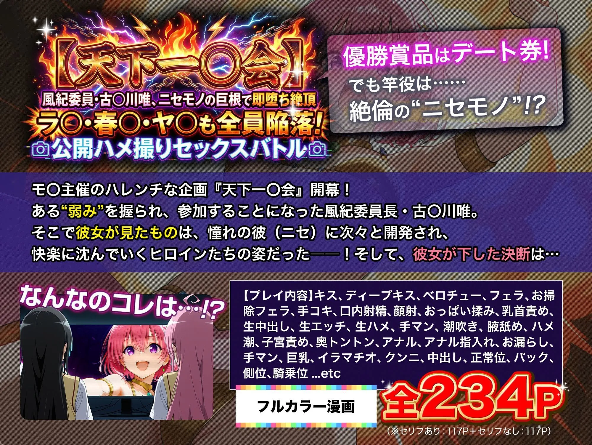 【ストーリー14Pまでの体験版があります】<<あらすじ>>「優勝賞品はリ〇さんとのデート券!」でも竿役は……絶倫の‘ニセモノ’!?モ〇主催のハレンチな企画『天下一〇会』開幕!ある‘弱み’を握られ、参加することになった風紀委員長・古〇川唯。そこで彼女が見たものは、憧れの彼(ニセ)に次々と開発され、快楽に沈んでいくヒロインたちの姿だった――!【収録内容】▼第1試合:西連寺春〇(処女喪失×即堕ち)「結城くんなら…いいよ…」清純派が、ニセモノの容赦ないピストンで白目を剥いて絶頂!▼第2試合:金色の〇(初アナル×完全敗北)「えっちぃのは嫌いです……そんなところ……入りません……ッ!」最強の刺客も、お尻の弱点は守れない!衆人環視のバックプレスで陥落!▼第3試合:ラ〇・サタリン・デビルーク(玩具責め×潮吹き)「なんか間違えちゃったぁ!?」自作の発明品が誤作動!?感度3000倍になった敏感ボディで、ニセ◯トにたっぷり種付けされるデ◯ルーク星の第1王女▼最終試合:古〇川唯(完全悪堕ち×変態化)「ハレンチなのは……私の身体でしたぁぁああ!!」拒絶していた理性はどこへ!?快楽SEXに脳まで溶かされ、最後は本物のリ〇も巻き込んで……?!カタブツ風紀委員が「快楽の虜」に生まれ変わる瞬間を、その目でお確かめください!迫力のフルカラーで描かれる天下一◯会!【プレイ内容】キス、ディープキス、ベロチュー、フェラ、お掃除フェラ、手コキ、口内射精、顔射、おっぱい揉み、乳首責め、生中出し、生エッチ、生ハメ、手マン、潮吹き、腋舐め、ハメ潮、子宮責め、奥トントン、アナル、アナル指入れ、お漏らし、手マン、巨乳、イラマチオ、クンニ、中出し、正常位、バック、側位、騎乗位…etc【収録内容】・本編(セリフあり):117P漫画・おまけ(セリフなし):117P全ページに加筆修正を行っています【注意事項】・本作品に登場する人物は全員成人済みです・本作品はフィクションです。実在の団体・人物とは一切関係ありません・本作品はAI生成物に加筆して作成しております