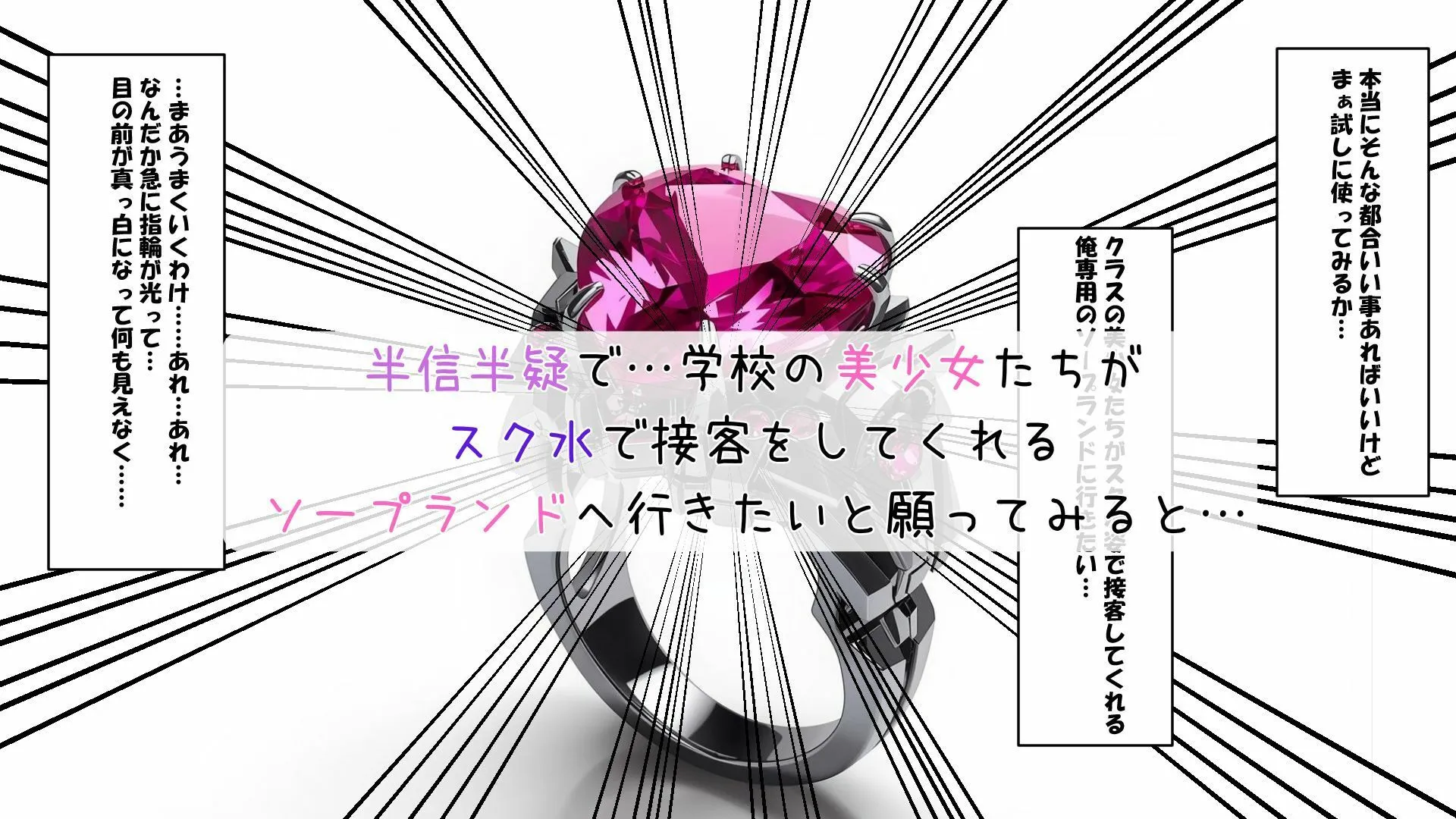 【あらすじ】陰キャでモテない主人公学校には、美少女がたくさんいるのに当然のようにそういう展開はなく妄想でシコる毎日ある日、ラ〇が落とした妄想を現実に出来るアイテムドリームワープくんを拾い半信半疑で『学校の美少女たちがスク水で接客をしてくれるソープランドへ行きたい』と願ってみると…妄想が現実に今まで妄想していただけの彼女達が、スク水姿で接客この世界ではどんな女の子も、どんなエッチな事も主人公の思い通りスクール水着を着てぱつぱつぴっちぴちのエッチなおっぱいもお尻も全部好き放題思い通りの世界で、エッチな時間を全力で楽しみまくれ【基本情報】本編112P+差分、おまけを含む合計222Pの大ボリューム全編FHDの高画質画像は基本的に全て画像生成AIで生成したものを人力で加工したものになります。