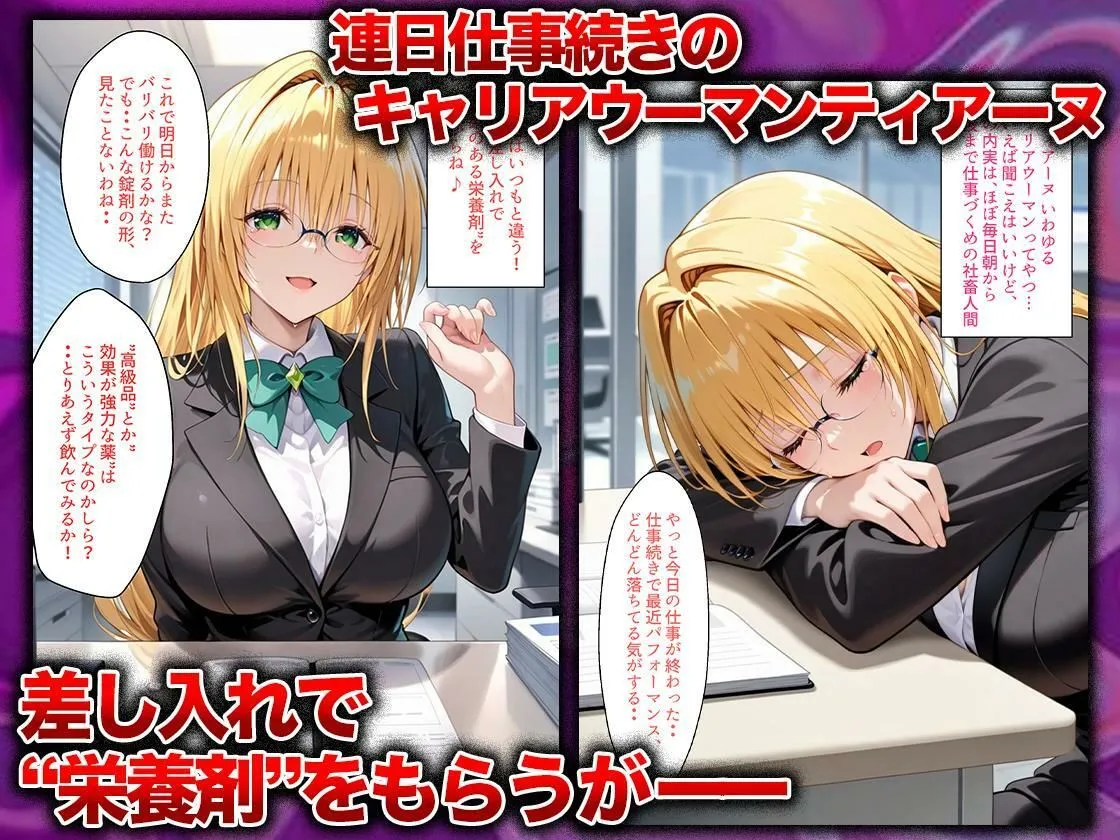 あかね馬用の興奮剤を飲んだ人妻の作品だよ。残業続きで心身ともに疲弊しきった人妻に、同僚が『これ、疲れが一気に飛ぶサプリだよ』って笑顔で渡した一粒なんだ