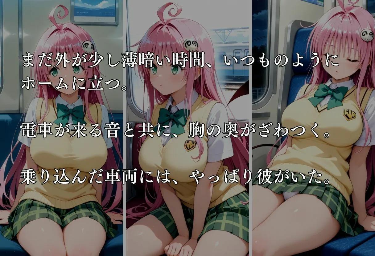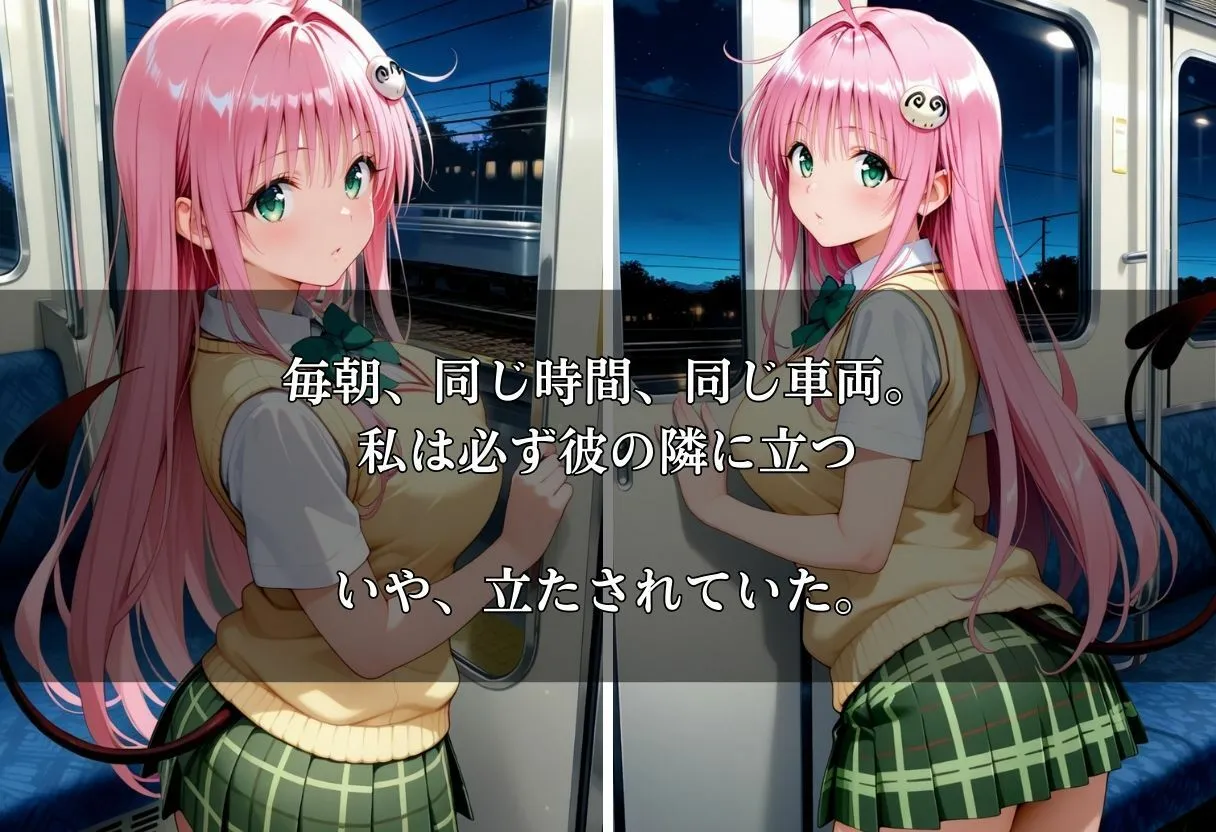 ※サンプル画像は本編より荒く、モザイクも大きくなっております。※アナルは全て無修正となります。【ストーリー】毎朝、同じ時間、同じ車両。私は必ず彼の隣に立っていた。いや、立たされていた。まだ外が少し薄暗い時間、いつものようにホームに立つ。電車が来る音と共に、胸の奥がざわつく。乗り込んだ車両には、やっぱり彼がいた。彼と出会ったのは2ヶ月前。その日も同じ通勤ルート、同じ場所に立っていただけだった。最初は偶然が重なっただけ――そう信じたかった。でも、背中や腰に触れる手が、毎日のように繰り返されるようになった。制服の上から伝わるじんわりとした熱。揺れる電車に合わせて、ゆっくりと動く指先。怖いはずなのに、心臓はどんどん速くなる。呼吸が浅くなり、膝が小さく震える。「やめなきゃ…」そう思っても、身体は動かない。むしろ、その感触を待ってしまっている自分に気づいてしまう。周りには乗客がいる。誰かに見られるかもしれない――その恐怖と興奮が混ざり合い、頭が真っ白になっていく。そして、ある日。カレンダーを見ても、生理が来ていないことに気づいた。不安で震える手で検査薬を使うと、表示ははっきりと「陽性」。何が正しいのか分からなくなった。そして今日も、あの指は私の奥を支配し続ける――。【登場人物】ToLOVEるララ・サタリン・デビルーク【シーン】居眠り乳揉み痴●射精手マンバック立ちバック中出し緊縛妊娠性行為(妊娠)事後etc…※この作品はAIを利用して作成したものです。※StableDiffusionを使用して生成しております※技術的な制約やAIの学習データによって、細部に破綻や不自然さが含まれる場合があります。購入前に、そのことを理解し、同意した上で購入を検討していただくことをお願いいたします。※購入後の取り扱いに不備があった場合こちらは一切責任を負いません。※商用目的での利用・第三者への譲渡・転載等が発見された際には法的処置をとらせていただき、損害賠償請求を致します。