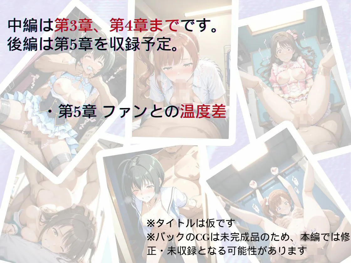 ※※注意※※このCG集はサークル「たぶん全年齢じゃないです」で販売していた『トップアイドルの裏帳簿〜華やかさの裏に眠る営業記録〜Cute中編』と同じ作品のため、重複購入されないようご注意ください。「清楚・純粋・憧れ」──そんなイメージで国民的な人気を誇る女性アイドルグループ。連続1位のヒット曲、CM契約、地上波バラエティの常連──だがその栄光の裏で、彼女たちは誰にも言えない‘裏の営業’を続けていた。事務所の幹部、番組プロデューサー、広告代理店の重役──枕営業リストには名の知れた業界人たちの名前が並ぶ。キラキラした笑顔の裏、彼女たちは悲痛な表情で身体を差し出す。ファンが知らない‘真実のアイドル像’を暴く、禁断の暴露系CG集。・第3章:週刊誌と圧力枕の現場を週刊誌に撮られてしまった。雑誌事務所への圧力と‘口止め’のため、ここでも純粋無垢な少女たちの身体は使われていく。「何をしてもいいんですよ?」プロデューサーにそう言われ、記者のドス黒い欲望は暴走する――・第4章:センターの交換条件ダンスと歌唱レッスン中、プロデューサーから新曲の発表を聞き喜ぶ3人。しかし新曲のセンターには選考があると聞かされるメンバー。センターを巡る裏交渉が始まる。選ばれるのは、もっとも従順な女。男どもの醜い願望は熾烈を極めるが、3人は一切抵抗せず、爛れた欲望を華奢な身体で余すことなく受け止める。Cuteの島〇卯月、五〇嵐響子、小〇向美穂。キラキラと光る表舞台とは違った3人の姿を、引き続きご覧ください。【CG数】第3章:191枚第4章:309枚—————合計:500枚総容量:約1.00GB※CG集のため、基本的にセリフはありません※中編は第3章、第4章までの収録です後編は第5章を収録予定※本作品は生成AIにより作成し、加筆・修正を加えております※本作品は全てフィクションであり、人物や設定等はすべて架空のものです※AIで生成された画像は実在キャラクターに類似している可能性がありますが、それは偶然の一致のため、他の作品とは一切関係がありません※本作品の登場人物は全て成人済みです※犯罪行為を助長する意図は一切ありません※購入後の取り扱いに不備があった場合、当サークルは一切の責任を負いません※技術的な制約やAIの学習データによって、細部に破綻や不自然さが含まれる場合があります(指の本数や服の色、装飾等)。購入前にその点をご了承の上で、ご検討をお願いいたします