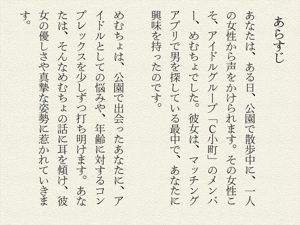 アイドルとしての悩みや年齢に対するコンプレックスを少しずつ打ち明けて、耳を傾けると優しさや真摯な姿勢に惹かれていくのよ