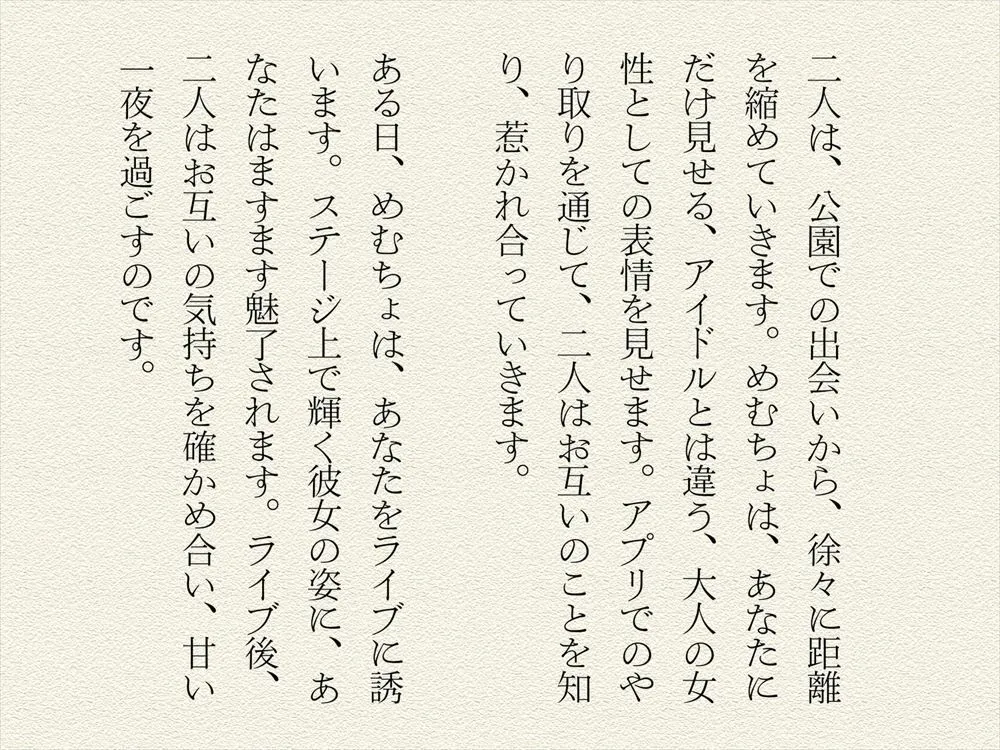 ある日MEMちょがライブに誘って、ステージ上で輝く姿にますます魅了されるわ。ライブ後にお互いの気持ちを確かめ合い、甘い一夜を過ごすんだから