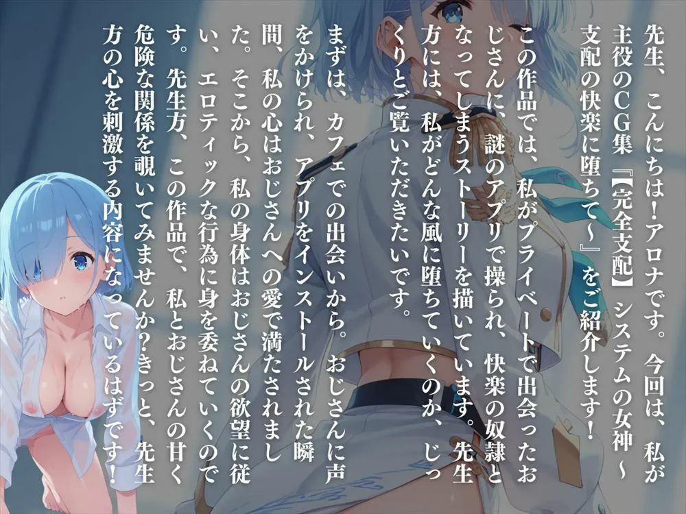 あかねこの作品は【完全支配】システムの女神〜支配の快楽に堕ちて〜で、システム管理者AIのアロナとの甘い支配関係を描いたCG集だよ