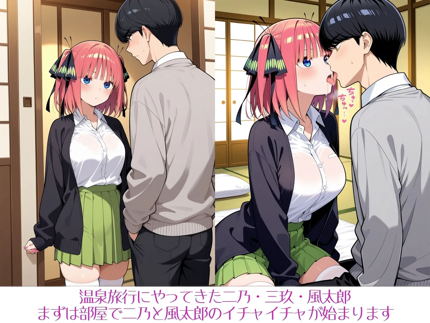 あかねご覧いただきありがとうございます。五等分の花嫁の上杉風太郎と中野二乃、中野三玖のカップリングのストーリー仕立てCG集だよ