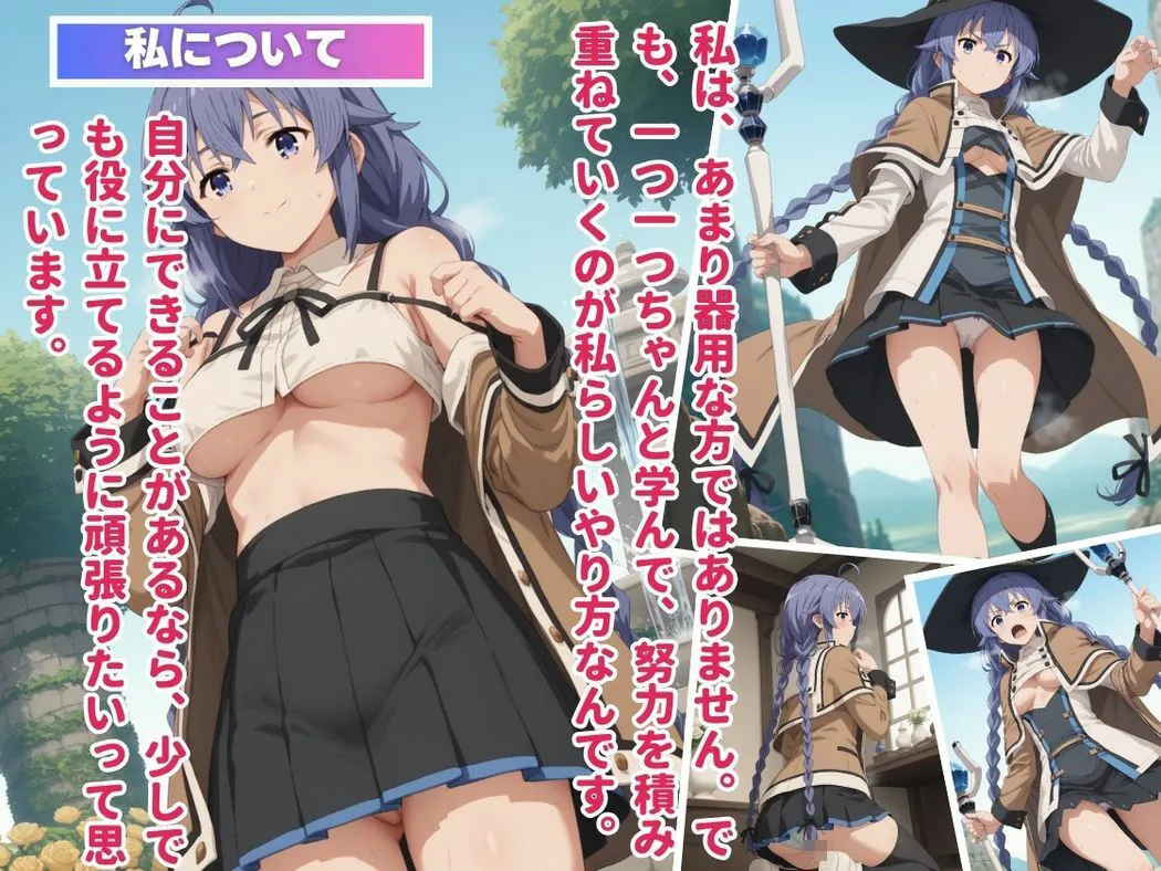 この作品は『先生の秘密の授業里を出た少女の、禁断の恋物語。彼女の運命は、アプリの先に待つ。』で、ミグルド族の里からやってきた水王級魔術師、ロ●シー・ミグルディア・ミグルディアのエロCG集だよ