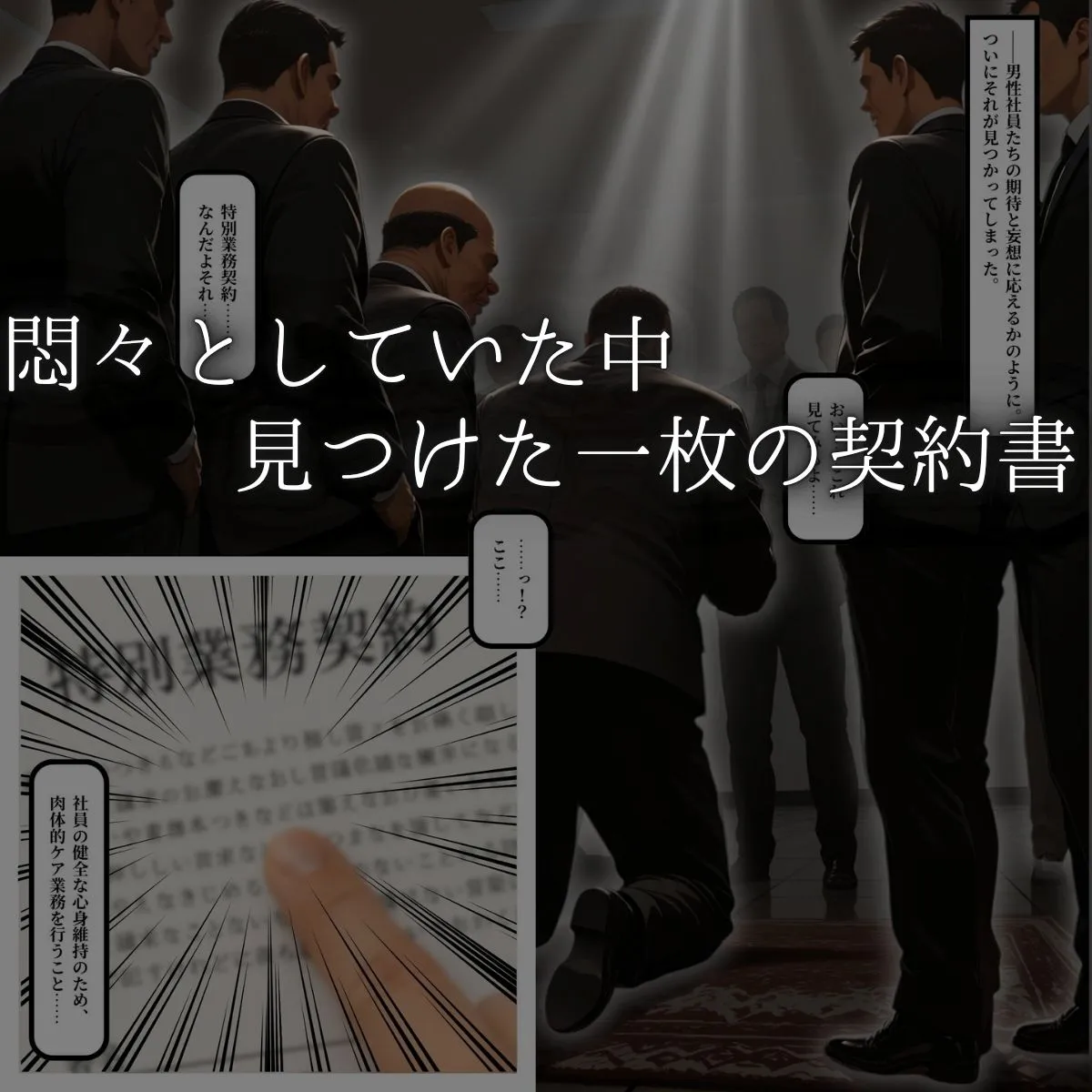 男ばかりのむさ苦しい会社に一人のギャルが入社してきた―。男たちの視線はギャルの体に釘付け悶々としていた社員らが見つけた1枚の特別業務契約書。その契約書を見つけたことにより、新入社員のギャルは社内での扱いが一変する。※本作品はAIを用いて作成しております。