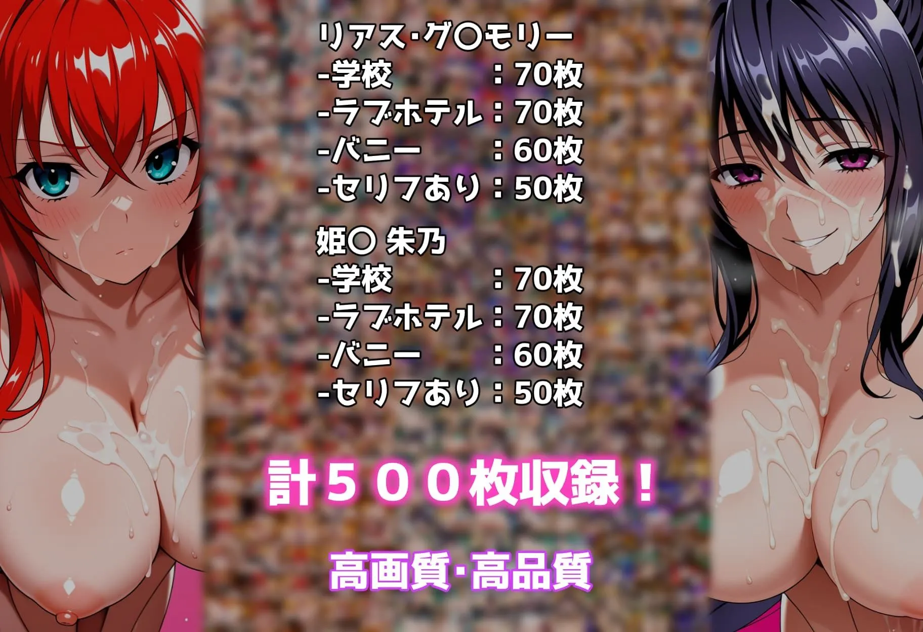 収録CGはリアス・グ〇モリーが250枚で、学校70枚、ラブホテル70枚、バニー60枚、セリフあり50枚だよ