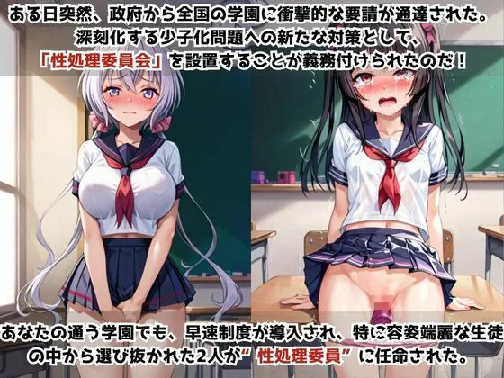 ■あらすじある日突然、政府から全国の学園に向けて衝撃的な要請が通達された。深刻化する少子化問題への新たな対策として、各学校に「性処理委員会」を設置することが義務付けられたのだ!その目的は、若者たちの性への理解と意識の向上、そして健全かつ積極的な生殖活動の促進という、かつてないスケールでの‘教育的指導’にあった。あなたの通う学園でも、早速制度が導入され、特に容姿端麗・性格多様な生徒の中から選び抜かれた2人の美少女が‘性処理委員’に任命された。彼女たちは当然抵抗するがそれもむなしく、学園生活を送りながらあなたのあらゆる性的欲求を受け止める存在となるのだ。あなたはこの学園で、どの子とどんなドスケベな学園ライフを送るのか?今、扉は開かれた。選ぶのはあなた――最高に濃厚で淫らな日々が、すぐそこに待っている……!■作品情報・2,000枚以上の画像からクオリティの高いものを厳選!・CG集ですが前戯⇒本番⇒変態プレイのようにストーリーを想像できる使いやすい構成・フルカラーCG:PNG形式(差分なし全て別画像)・スマホで見やすい縦長画像■収録内容【1】休み時間はトイレでご奉仕編収録プレイ:ストリップ、キス、前戯、チンキス、手コキ、フェラ、イラマチオ、パイズリなど衣装:セーラー服【2】体育の授業はSEX実習編(プール)収録プレイ:乳揉み、フェラ、顔射、イラマチオ、バック、I字ポーズ挿入、駅弁、正常位、中出し、騎乗位など衣装:スクール水着【3】体育の授業はSEX実習編(更衣室)収録プレイ:ストリップ、乳揉み、チンキス、パイズリ、手コキ、顔射、足コキ、フェラ、バック、I字ポーズ挿入、駅弁、中出し、アナルSEX衣装:体操服(ブルマ)【4】昼休みは保険室で変態プレイ編収録プレイ:SM、縛り、拘束、目隠し、スパンキング、デンマ攻め、機械姦、搾乳など衣装:全裸【5】放課後は教室で終わらない恥辱調教&徹底凌●編収録プレイ:オナニー披露、おもらし、首絞めっクス、乱交、輪●、精飲、事後など衣装:セーラー服■作品構成1.雪○クリス【1】トイレ編:44枚【2】プール編:35枚【3】更衣室編:56枚【4】保健室編:41枚【5】教室編:37枚計:213枚2.月○調【1】トイレ編:35枚【2】プール編:37枚【3】更衣室編:49枚【4】保健室編:42枚【5】教室編:42枚計:205枚合計:418枚【制作に際して】※本作品は画像生成AI「StableDiffusion」により作成され、一部に手動での加筆・調整を行っております。※AI作品の特性上、描写に違和感や破綻がある場合がございますが、予めご了承ください。※すべて、AI生成画像で、全員20歳以上です。※本作はあくまでフィクションであり、いかなる犯罪行為の助長を意図するものではございません。