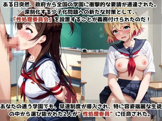 ■あらすじある日突然、政府から全国の学園に向けて衝撃的な要請が通達された。深刻化する少子化問題への新たな対策として、各学校に「性処理委員会」を設置することが義務付けられたのだ!その目的は、若者たちの性への理解と意識の向上、そして健全かつ積極的な生殖活動の促進という、かつてないスケールでの‘教育的指導’にあった。あなたの通う学園でも、早速制度が導入され、特に容姿端麗・性格多様な生徒の中から選び抜かれた2人の美少女が‘性処理委員’に任命された。彼女たちは当然抵抗するがそれもむなしく、学園生活を送りながらあなたのあらゆる性的欲求を受け止める存在となるのだ。あなたはこの学園で、どの子とどんなドスケベな学園ライフを送るのか?今、扉は開かれた。選ぶのはあなた――最高に濃厚で淫らな日々が、すぐそこに待っている……!■作品情報・2,000枚以上の画像からクオリティの高いものを厳選!・CG集ですが前戯⇒本番⇒変態プレイのようにストーリーを想像できる使いやすい構成・フルカラーCG:PNG形式(差分なし全て別画像)・スマホで見やすい縦長画像■収録内容【1】休み時間はトイレでご奉仕編収録プレイ:ストリップ、キス、前戯、チンキス、手コキ、フェラ、イラマチオ、パイズリなど衣装:セーラー服【2】体育の授業はSEX実習編(プール)収録プレイ:乳揉み、フェラ、顔射、イラマチオ、バック、I字ポーズ挿入、駅弁、正常位、中出し、騎乗位など衣装:スクール水着【3】体育の授業はSEX実習編(更衣室)収録プレイ:ストリップ、乳揉み、チンキス、パイズリ、手コキ、顔射、足コキ、フェラ、バック、I字ポーズ挿入、駅弁、中出し、アナルSEX衣装:体操服(ブルマ)【4】昼休みは保険室で変態プレイ編収録プレイ:SM、縛り、拘束、目隠し、スパンキング、デンマ攻め、機械姦、搾乳など衣装:全裸【5】放課後は教室で終わらない恥辱調教&徹底凌●編収録プレイ:オナニー披露、おもらし、首絞めっクス、乱交、輪●、精飲、事後など衣装:セーラー服■作品構成一ノ瀬ち●る【1】トイレ編:48枚【2】プール編:48枚【3】更衣室編:46枚【4】保健室編:49枚【5】教室編:49枚計:240枚七海●美【1】トイレ編:47枚【2】プール編:48枚【3】更衣室編:49枚【4】保健室編:48枚【5】教室編:48枚計:240枚合計:480枚【制作に際して】※本作品は画像生成AI「StableDiffusion」により作成され、一部に手動での加筆・調整を行っております。※AI作品の特性上、描写に違和感や破綻がある場合がございますが、予めご了承ください。※すべて、AI生成画像で、全員20歳以上です。※本作はあくまでフィクションであり、いかなる犯罪行為の助長を意図するものではございません。