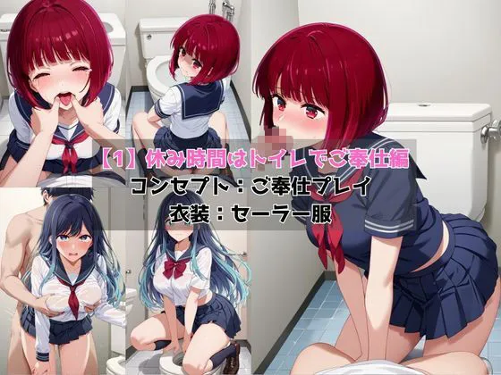 収録内容は【1】休み時間はトイレでご奉仕編。ストリップ、キス、前戯、チンキス、手コキ、フェラ、イラマチオ、パイズリなど。衣装はセーラー服だよ