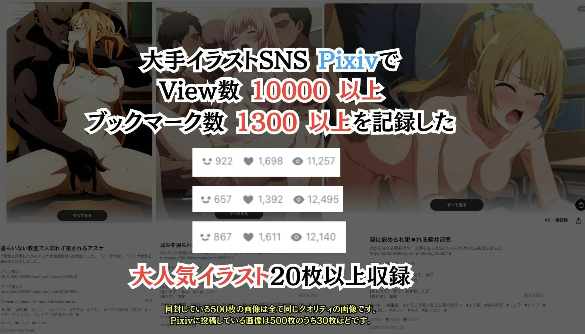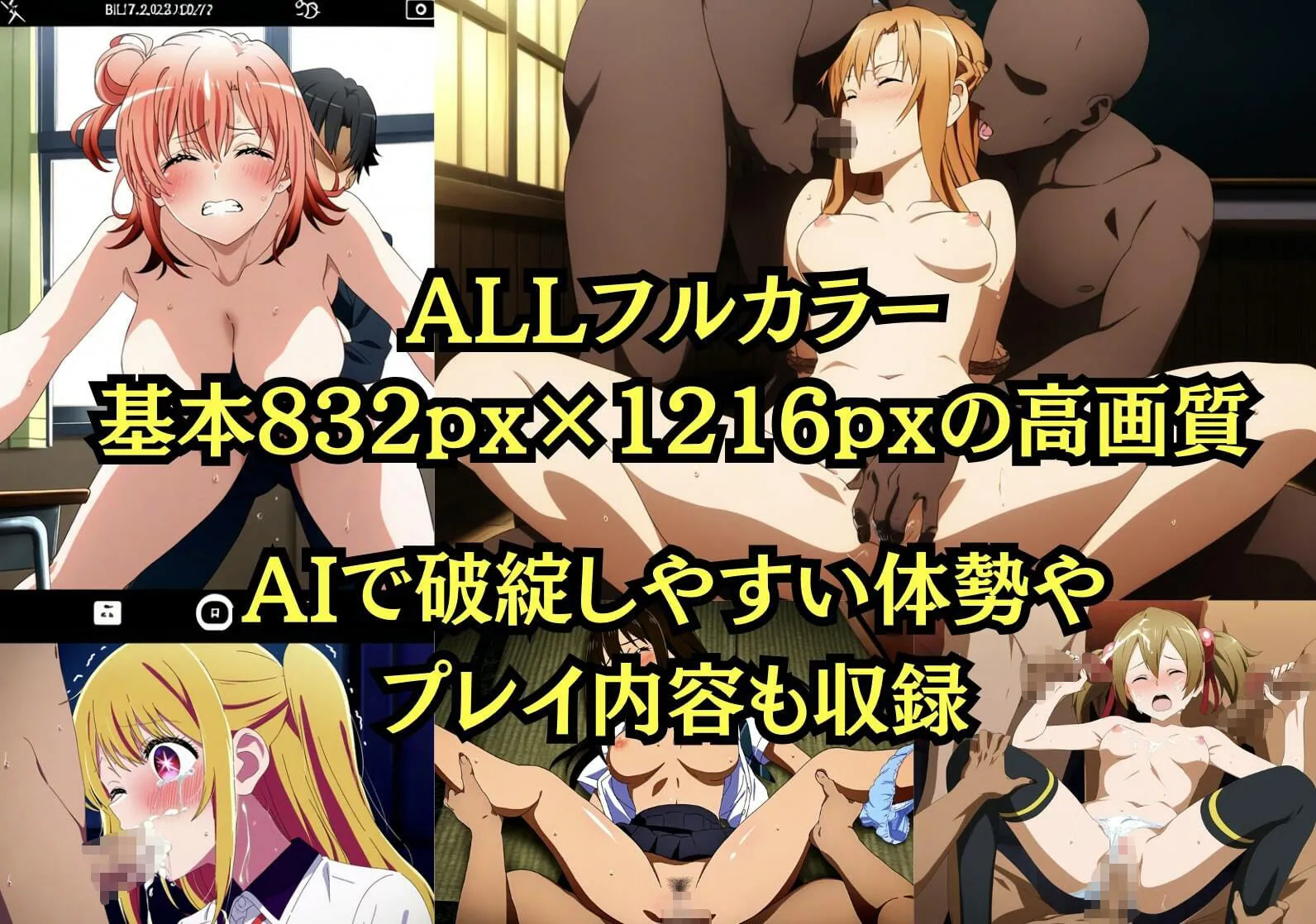 同等レベルのイラストを500枚詰め込んでるのよ。AIが苦手な複数人、複数シチュ掛け合わせも多数収録で、手マン+キス、手マン+イラマとかね