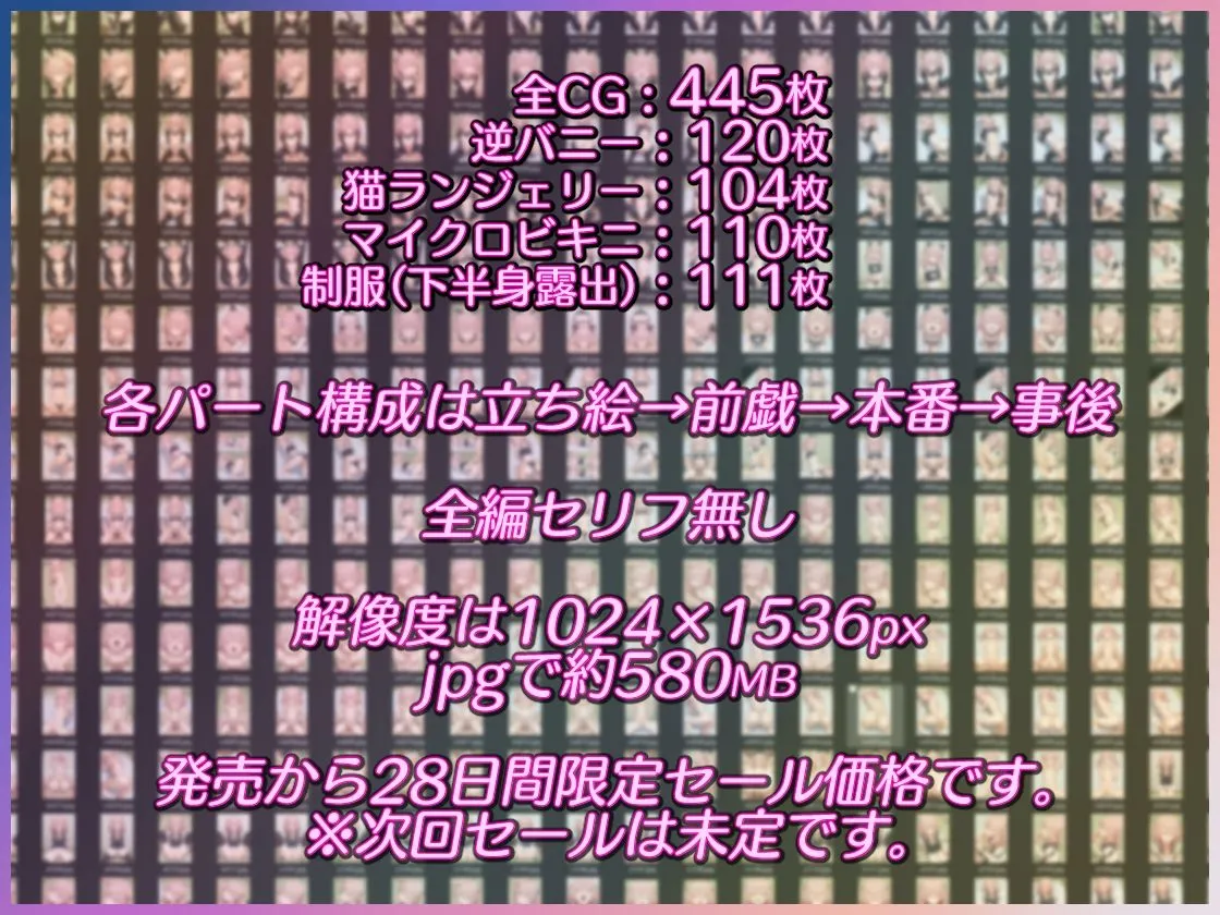 衣装は逆バニー120枚、猫ランジェリー104枚、マイクロビキニ110枚、制服下半身露出111枚だよ