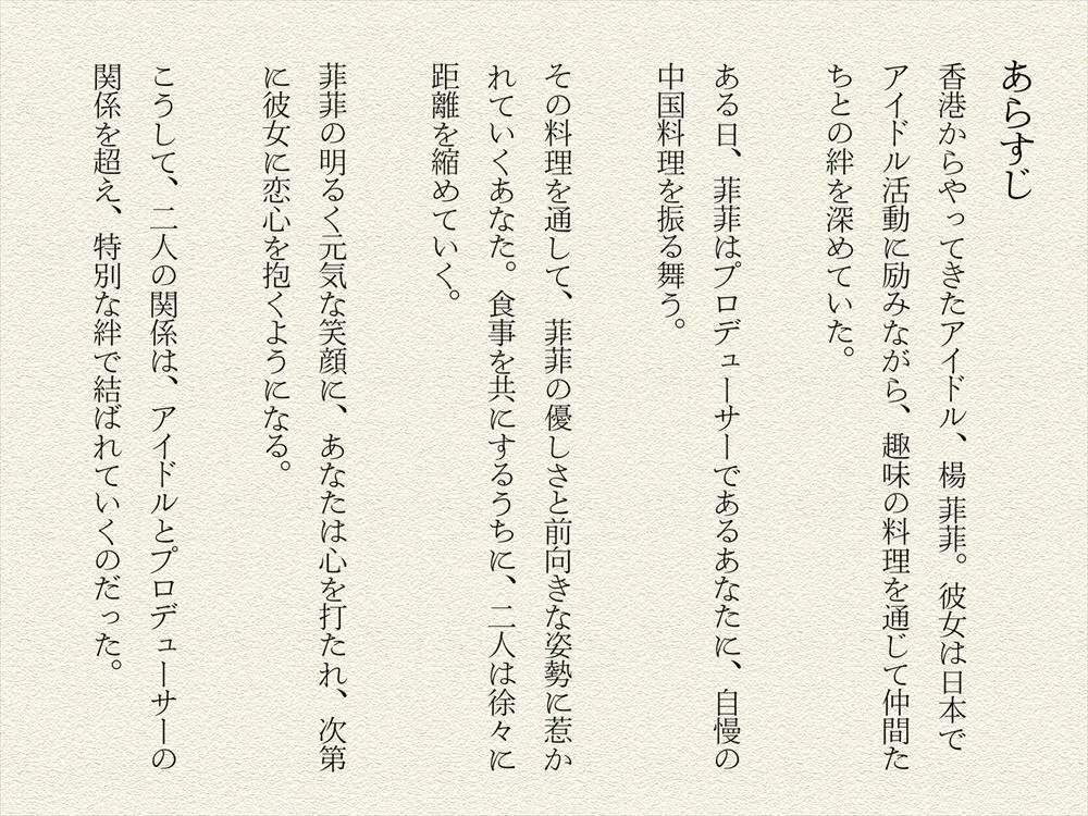 ある日プロデューサーであるあなたに自慢の中国料理を振る舞って、優しさと前向きな姿勢に惹かれていくんだ