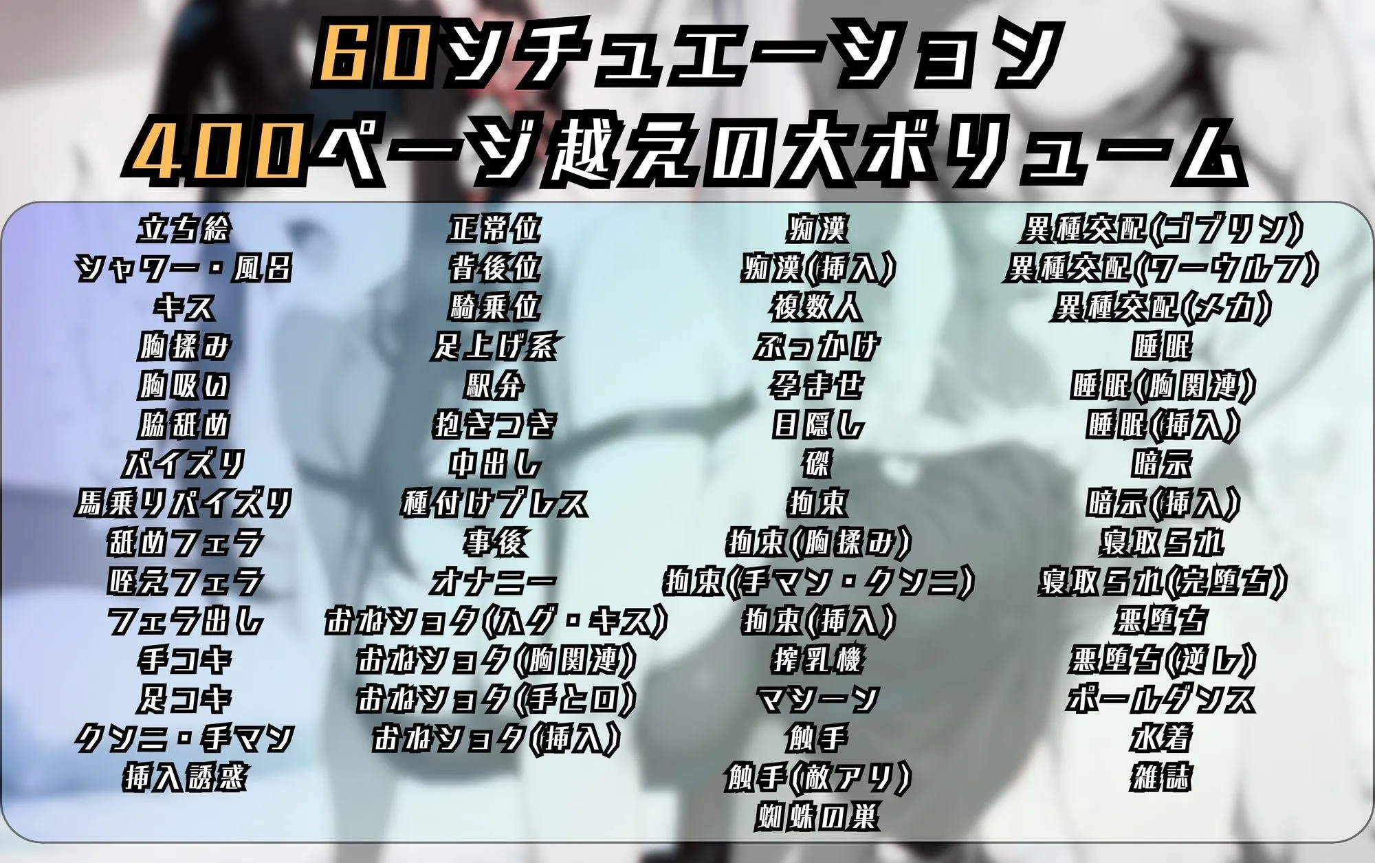 【作品概要】スパイファミ〇〇に登場するヨ〇さんの「60シチュエーション」「500ページ」の大ボリューム画像集。基本から凌〇系、触手や機械に異種との絡み、そして完堕ちや孕ませまで・・エッチな各シチュエーションを5枚以上でそれぞれ収録!【シチュエーション(60種類)】立ち絵シャワー・風呂キス胸揉み胸吸い脇舐めパイズリ馬乗りパイズリ舐めフェラ咥フェラフェラ(事後)手コキ足コキクンニ・手マン挿入誘惑正常位背後位騎乗位足上げ駅弁抱きつき中出し種付けプレス事後オナニーおねショタ(ハグ・キス)おねショタ(胸関連)おねショタ(手コキ・フェラ)おねショタ(挿入)痴〇痴〇(挿入)複数人ぶっかけ孕ませ目隠し磔拘束拘束胸揉み拘束手マン・クンニ拘束挿入搾乳機マシーン触手触手の敵蜘蛛の巣異種交配(ゴブリン)異種交配(人狼)異種交配(メカ)睡眠睡眠(胸関連)睡眠(挿入)暗示暗示(挿入)寝取られ寝取られ(完堕ち)悪落ち悪落ち逆レポールダンス水着雑誌【画像枚数】500枚【画像サイズ】1632×2048or2048×1632===============================※本作はAI生成画像を加筆、修正した作品となります。※登場人物は18歳以上になるよう生成しています。※指などの細かい部分に生成AI特有の乱れがみられる場合がございますがご容赦ください。※当作品は「PixAI」にて制作しています。※当作品を無断で転載、複製、改変、頒布することは固く禁じます。