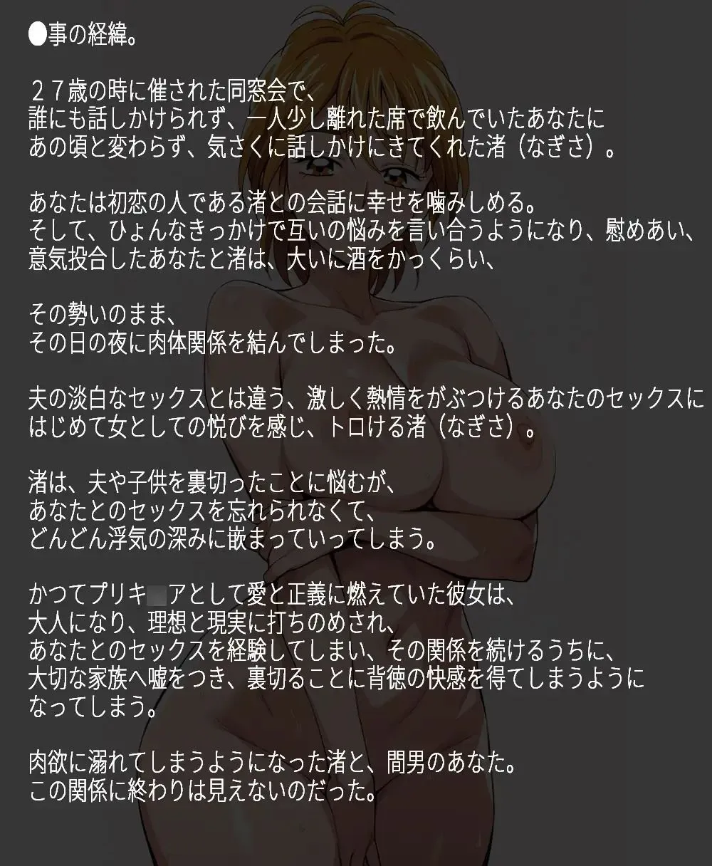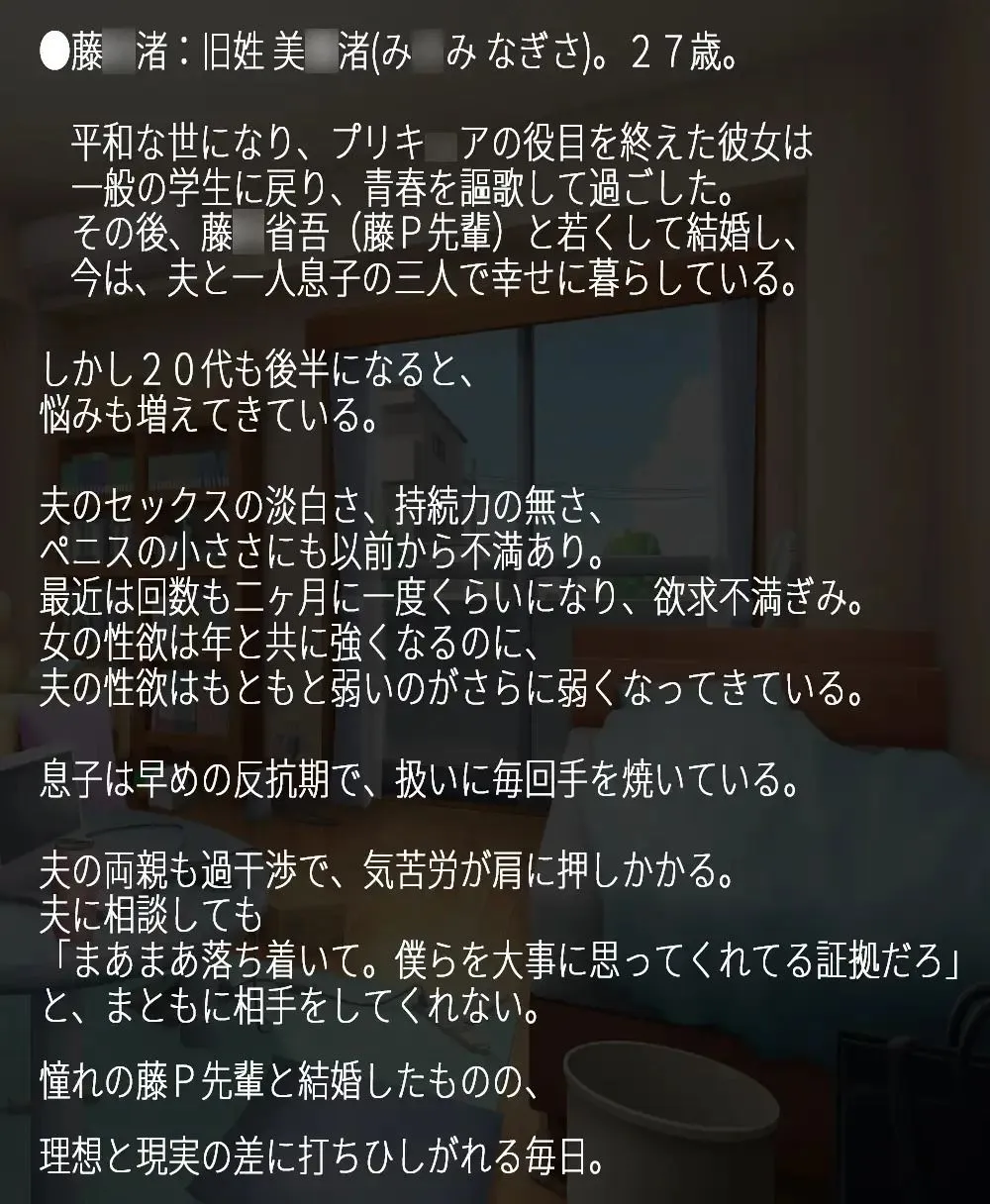 藤○渚、旧姓美○渚で、藤○省吾と結婚した渚は夫と一人息子の三人で幸せに暮らしていたけど、20代後半になると悩みが増えてきてるのよ