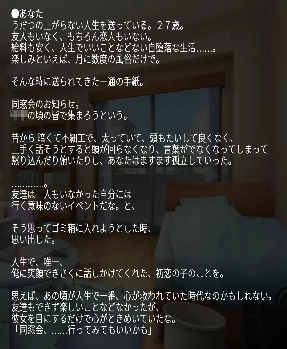 27歳の同窓会で誰にも話しかけられず一人で飲んでたあなたに気さくに話しかけてきて、互いの悩みを言い合って慰めあい意気投合、大いに酒を飲んでその夜に肉体関係を結んじゃったよ