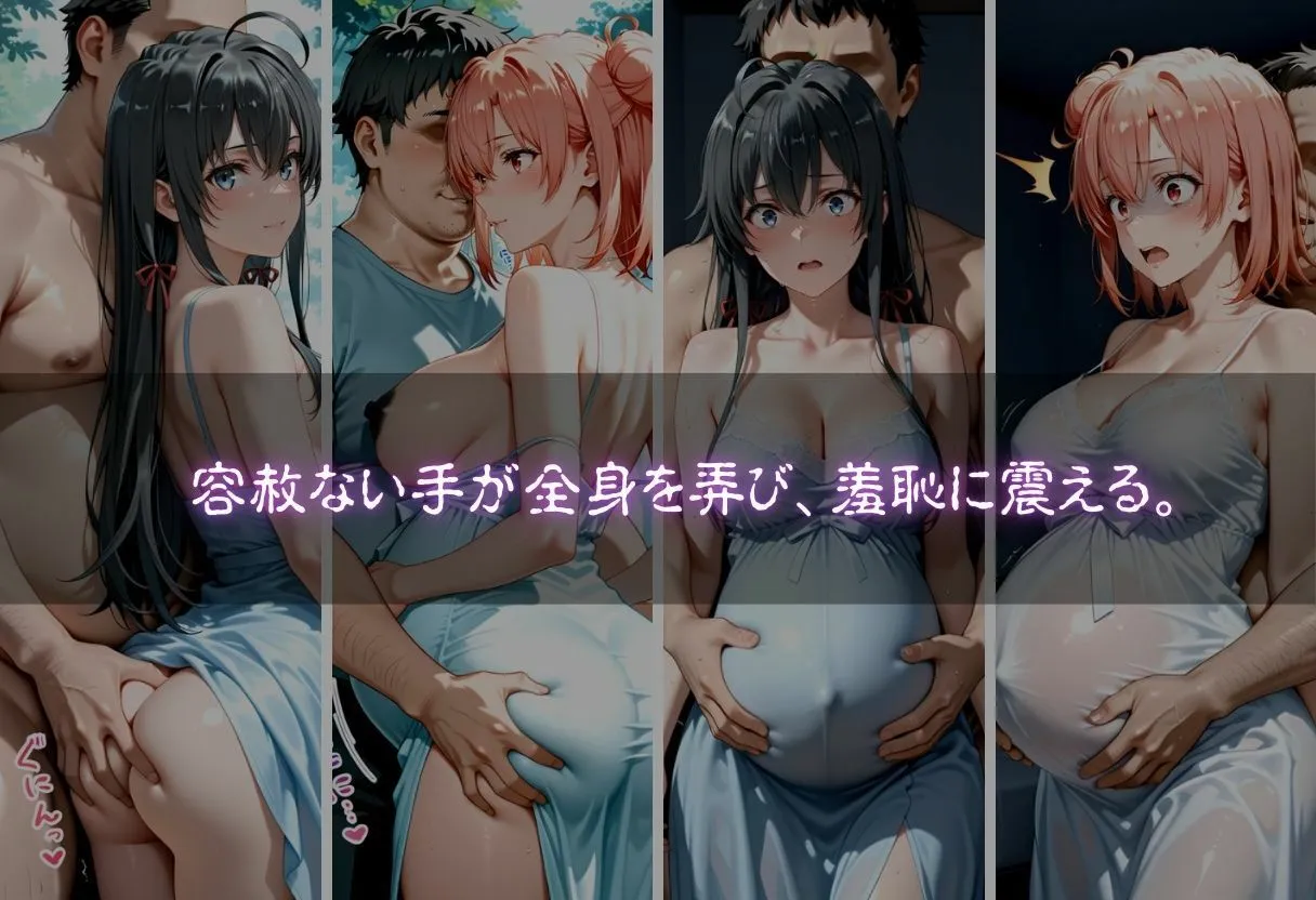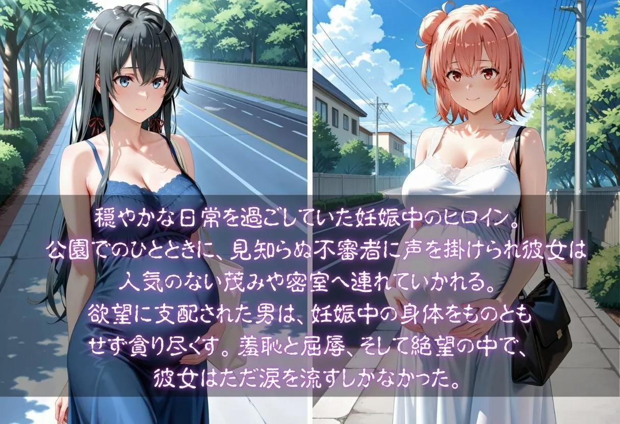 ※サンプル画像は本編より荒く、モザイクも大きくなっております。※アナルは全て無修正となります。【ストーリー】身ごもったヒロインに訪れるのは、安らぎではなく終わりのない悪夢。守るべき命を抱えたまま、彼女の身体は容赦なく蹂躙されていく。抗うことも逃げることも許されず、妊娠中という最も無防備な状態で、徹底的に弄ばれる――。絶望と背徳が交錯する、禁断の凌●ストーリー。【登場人物】1雪ノ下雪乃2由比ヶ浜結衣【シーン】〔野外〕1着衣2声を掛けられ茂みに連れていかれる3脱がされ触られる(下着なし)4弄り5手マンクンニ6放尿7イラマチオ8性行為9事後[密室]1着衣2声を掛けられ密室に連れていかれる3緊縛4弄り5手マンクンニ6放尿7イラマチオ8性行為9事後※この作品はAIを利用して作成したものです。※StableDiffusionを使用して生成しております※技術的な制約やAIの学習データによって、細部に破綻や不自然さが含まれる場合があります。購入前に、そのことを理解し、同意した上で購入を検討していただくことをお願いいたします。※購入後の取り扱いに不備があった場合こちらは一切責任を負いません。※商用目的での利用・第三者への譲渡・転載等が発見された際には法的処置をとらせていただき、損害賠償請求を致します。