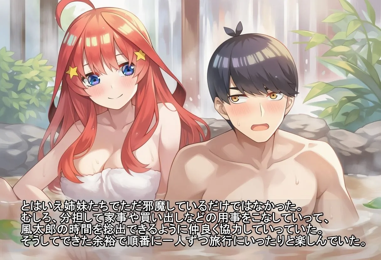 こちらは『NovelAI』で作成された、『五〇分の花嫁』の同人CG集となっています。いわゆる「百合の間に挟まる男」ものでもあるので苦手なかたはご注意ください。五つ子の姉妹たちに好かれるという状況から四葉を選んだ風太郎は、彼女と上京して同棲を開始する。新居にてはじまる初々しい生活を満喫していたのだが、4月1日に知らないアドレスからメールが届いた。なんとそこには最愛の四葉が自分以外に抱かれているR18な写真が添付されていて。とはいっても相手は実の姉妹なレズプレイだったが。複数枚の画像を見たかぎりでは五姉妹全員がさまざまな組み合わせで愛し合っているものの、この五つ子たちには他の姉妹に変装して演技するという悪癖がある。多少加工が入っている画像データだけでは判断がつかない。送り主もすぐ見分けがつかないことはわかっていたのだろう。メールの文章は『五つ子ゲーム・リターンズ』とだけ記されていたのだった。見抜いてみせろ、という風太郎への挑戦状なのだろう。ただのエイプリルフールの悪ふざけではなく、それからは不定期にまたメールが届き、それには写真データや動画が添付されていた。動画加工ソフトを通しているのか見極めにくい。しかしどこかには見分けるヒントがあるはずだと風太郎は繰り返し再生して動画をチェックしていくのだった。そう、バキバキに勃起させながら。彼女である四葉はもちろん、四葉と乳繰り合っている他の姉妹たちもまとめて●す妄想が浮かべながらリピート再生をしていく。それこそが真犯人たちの狙いであることに気づかずに──そう、レズ動画を繰り返し視聴させることで風太郎の性癖を狂わせて、五姉妹全員に強く発情するようにして誘惑を効きやすくして、ハーレムルートに突入させようという罠だったのだった。もちろん犯人は五姉妹の全員。単独で選ばれていた四葉も姉妹たちに説得されてしまっていたのだった。というのが前作までの展開で、今作はそれからのハーレムになったあとのあれこれになっています。表紙1枚、ストーリーを簡単に説明するためのテキスト付きのイラスト(サンプル画像にあるもの)が10枚、イラストオンリーのセリフなし差分なしのものが489枚の合計500枚になります。◆五姉妹たちが二人や三人で百合ったりレズったりして風太郎の興奮を煽っているものと、我慢できずに風太郎がわからせるべくる複数プレイしているハーレムものが混ざっているR18CG集です。ただ五つ子たちが一緒に遊んでいるだけのイラストから、キスしているものにお互いの性感帯を刺激しているもの、W手コキや3Pしているものなど幅広く取り揃えてあります。