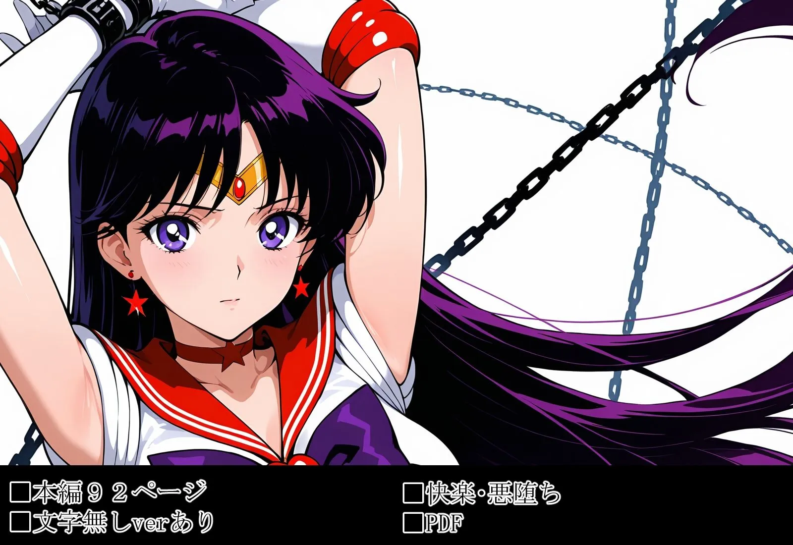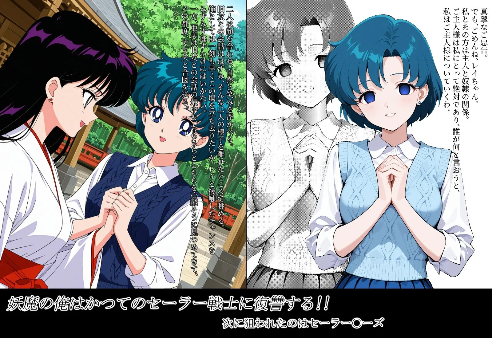 妖魔の俺はかつてのセーラー戦士に復讐する美少女戦士セー〇ームーンのセー〇ー〇ーズの物語です。かつて妖魔だった俺は命令のもとに人間のエナジーを奪っていた。そこに現れたセー〇ー戦士たちに俺の仲間たちは次々と倒れていった。その時に彼女たちから投げかけられた屈辱的な言葉は俺のプライドに深く傷つくものだった。この言葉を胸に刻み、セー〇ー戦士に復讐を決めた俺は最初のターゲット、水野〇美を堕とした。彼女の協力のもと、次なるターゲットはセー〇ー〇ーズに決めた――本編:92ページ文字無し版あり解像度:1664×2432※本作は生成AIツールで作成したAI画像に加筆修正を行った作品です。※本作はSDXL派生モデル(Illustrious)を使用しております。※AIによる画像生成で作成されているため、細部に破綻や矛盾が生じている場合がございます。※本作で描かれるシチュエーションは全てフィクションであり、登場する人物や設定等は架空のものです。また犯罪、その他違法行為を助長する意図はございません。