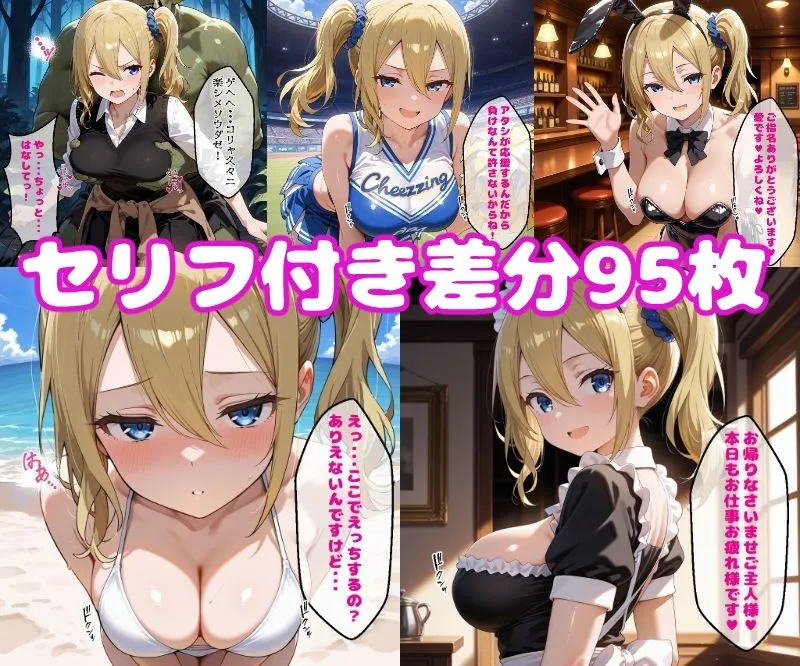 フォルダ内容はオーク、チア、バニー、ビキニ、メイド、触手、縛りセリフ付きCG差分95枚、PDF同梱だよ