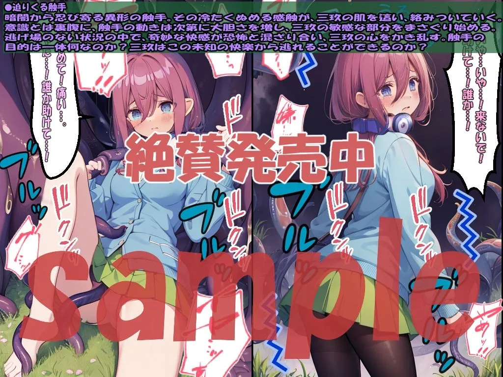 意識とは裏腹に、触手の動きは次第に大胆さを増し、三玖の敏感な部分をまさぐり始めるんだ。逃げ場のない状況の中で、奇妙な快感が恐怖と混ざり合い、三玖の心をかき乱すよ