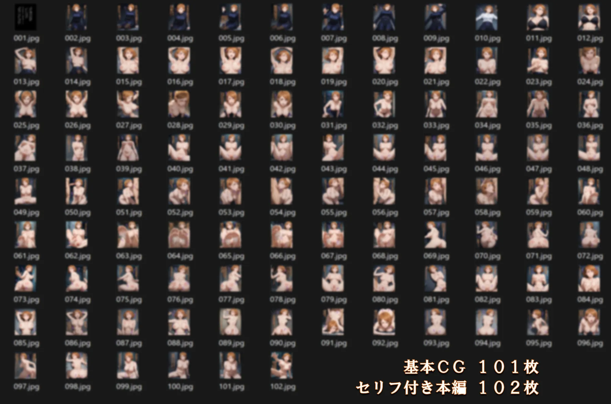 内容物は全204ページ。基本CG101枚、本編102ページ、表紙1枚、文字あり版102枚、文字なし版102枚なのよ