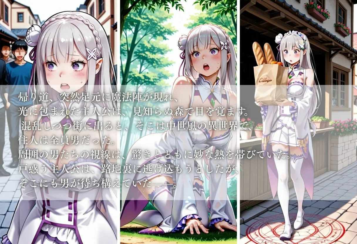 ※サンプル画像は本編より荒く、モザイクも大きくなっております。※アナルは全て無修正となります。※全てのイラストはAIが生成したものであり実在の人物とは一切関係ありません。【ストーリー】放課後の帰り道、突然足元に魔法陣が現れ、光に包まれた主人公は、見知らぬ森で目を覚ます。混乱しつつ街に出ると、そこは中世風の異世界で、住人は全員男だった。周囲の男たちの視線は、驚きとともに妙な熱を帯びていた。戸惑う主人公は、路地裏に逃げ込もうとしたが、そこにも男が待ち構えていた、、、。【シーン】1帰り道2魔法陣の出現3森へ転生4街へ出る、男たちに見られる5路地裏で襲われる6服の上からボディータッチ7まんこを広げられる8手マン・クンニ9放尿10全裸で体を隠す11拘束12イマラチオ13性行為14事後15部屋で落ち込む16寝る17胸を触られ起きる18手マン・クンニ19イマラチオ20性行為21事後・虚な目※StableDiffusionを使用して生成しております。※技術的な制約やAIの学習データによって、細部に破綻や不自然さが含まれる場合があります。購入前に、そのことを理解し、同意した上で購入を検討していただくことをお願いいたします。※購入後の取り扱いに不備があった場合こちらは一切責任を負いません。※商用目的での利用・第三者への譲渡・転載等が発見された際には法的処置をとらせていただき、損害賠償請求を致します。