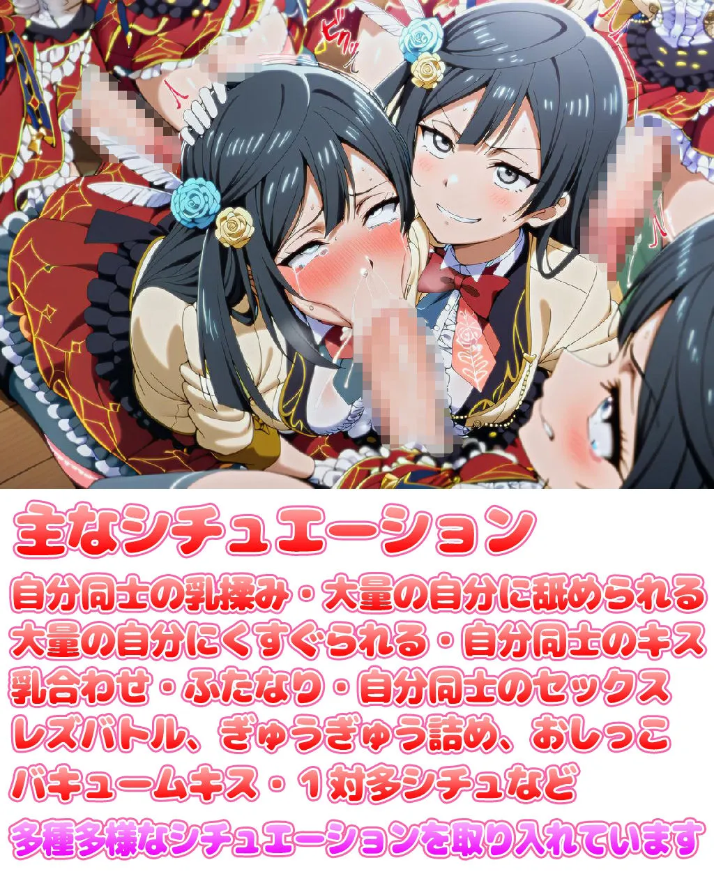自分同士のセックス、レズバトル、乳吸いも入ってるわ。ぎゅうぎゅう詰めおしっこやバキュームキスもあって、多種多様な1対多シチュがこれでもかってくらい詰まってるでしょ